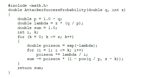 为计算攻击者现在仍然能赶上的概率,我们给每个他可能达到的进度的泊松密度乘以他在那个进度能赶上诚实链的概率: