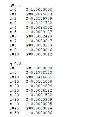 运行得到一些结果,我们可以看到概率随 z 呈指数下降。”