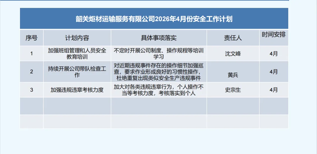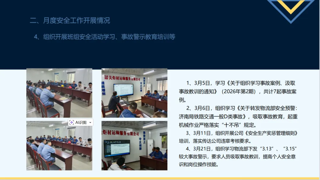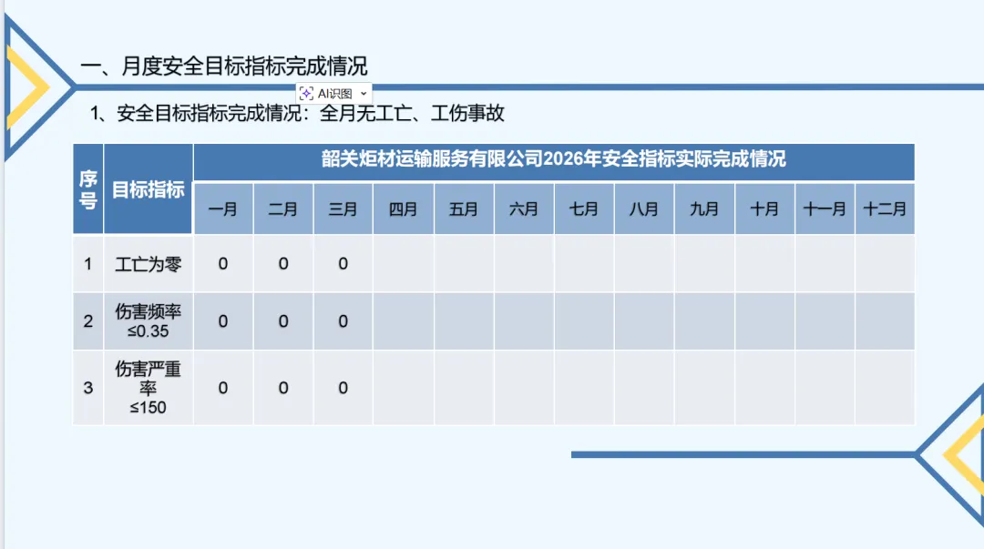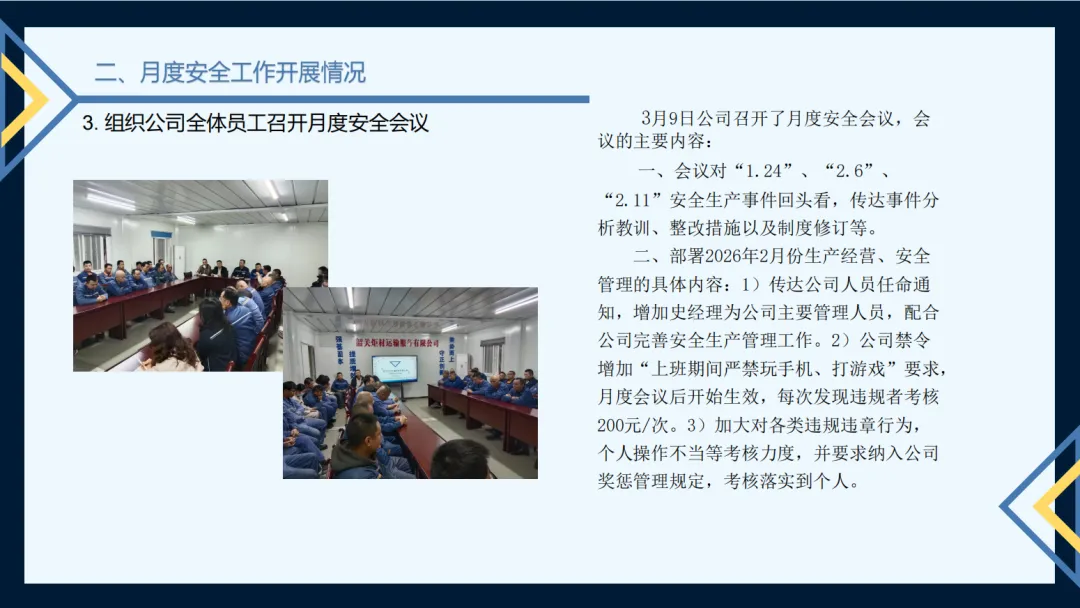 对于运输企业来说,"安全"这两个字有多重要?相信每一位从业者心里都有答案。但把"安全"从口号变成行动,从行动变成习惯,从习惯变成文化,这条路并不好走。最近,我们拿到了一份来自韶关炬材运输服务有限公司的3月份安全生产例会报告。这家拥有79名员工的企业,在过去一个月里交出了一份让人眼前一亮的安全成绩单:零事故、零伤亡、隐患100%整改。今天,我们就从这份真实的安全例会报告出发,来聊聊运输企业到底应该怎么做安全管理。一、零事故的背后:先定目标,再谈执行