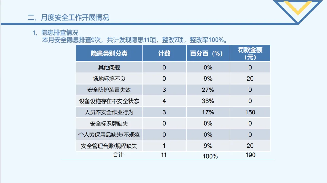 很多人觉得隐患排查就是"走一圈、看一遍",但炬材公司的报告告诉我们:真正的隐患排查,是有体系、有数据、有追踪的。11项隐患全部整改完成,这个100%的整改率,是他们安全管理能力的直接体现。隐患排查不只是发现问题,更重要的是分析问题的根源。36%的隐患来自设备设施,27%来自安全防护装置——这两项加起来超过60%。说明企业在设备管理上还需要加强日常维护和定期检修。而17%的人员不安全行为,虽然占比不是最高,但被罚了150元——这体现的是"违规必究"的管理态度。? 建议:建立隐患分类台账,按月统计、按类分析,找到问题的高发区域,针对性制定改进措施。