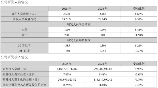 2025年公司研发投入10.92亿元,同比增长9.96%,占营业收入比例7.60%。