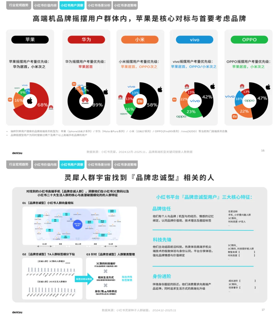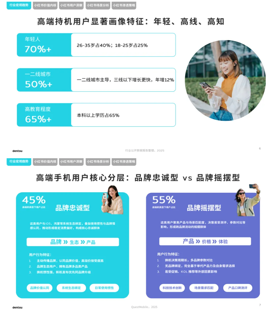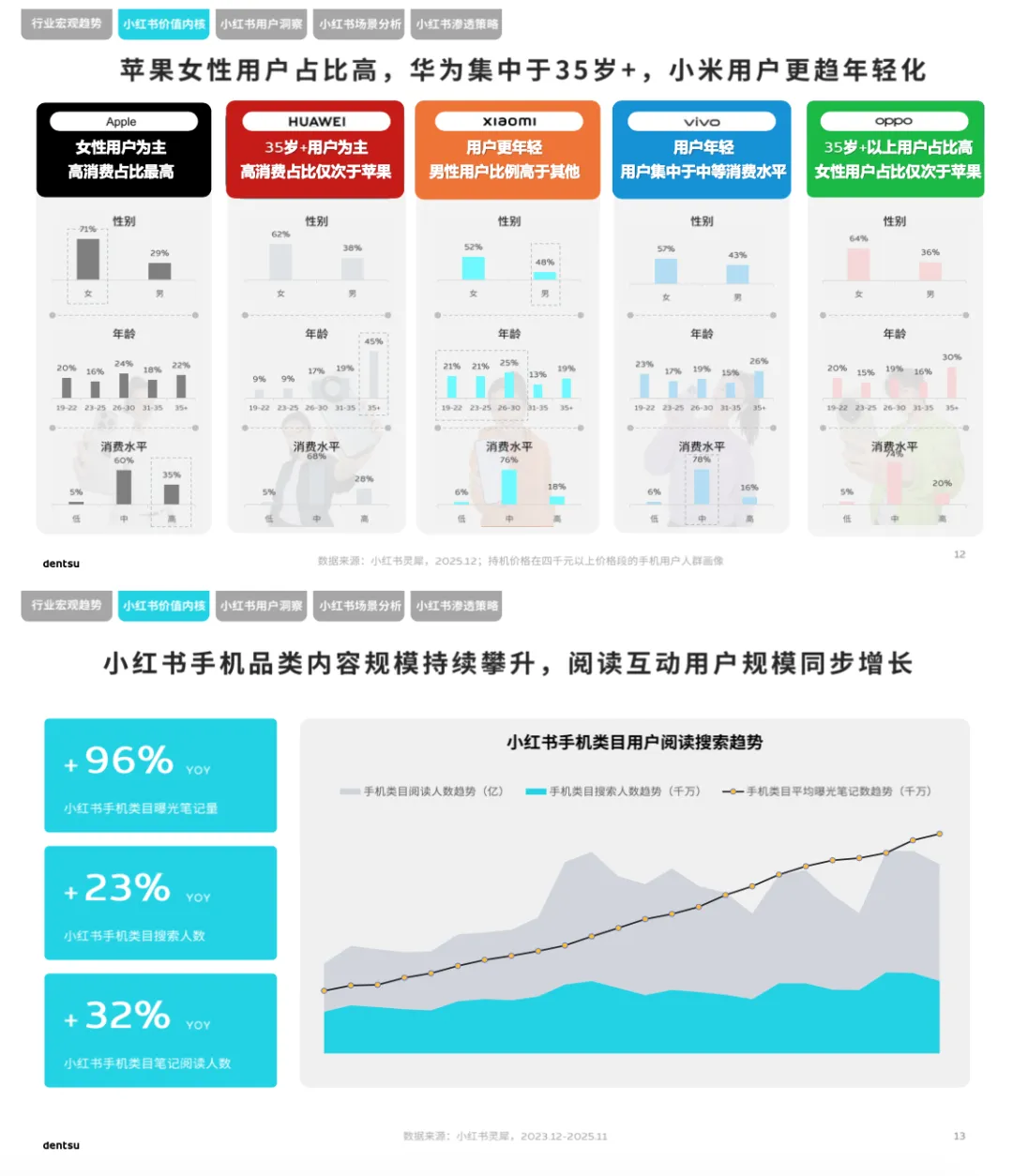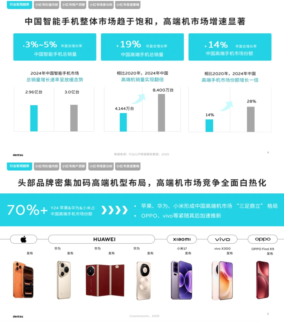 中国#智能手机 市场趋于饱和,高端机市场增速显著,头部品牌密集布局高端手机,市场竞争进入白热化。小红书与高端手机用户画像高度匹配,高端持机用户占比显著,相关笔记及搜索量持续增长。