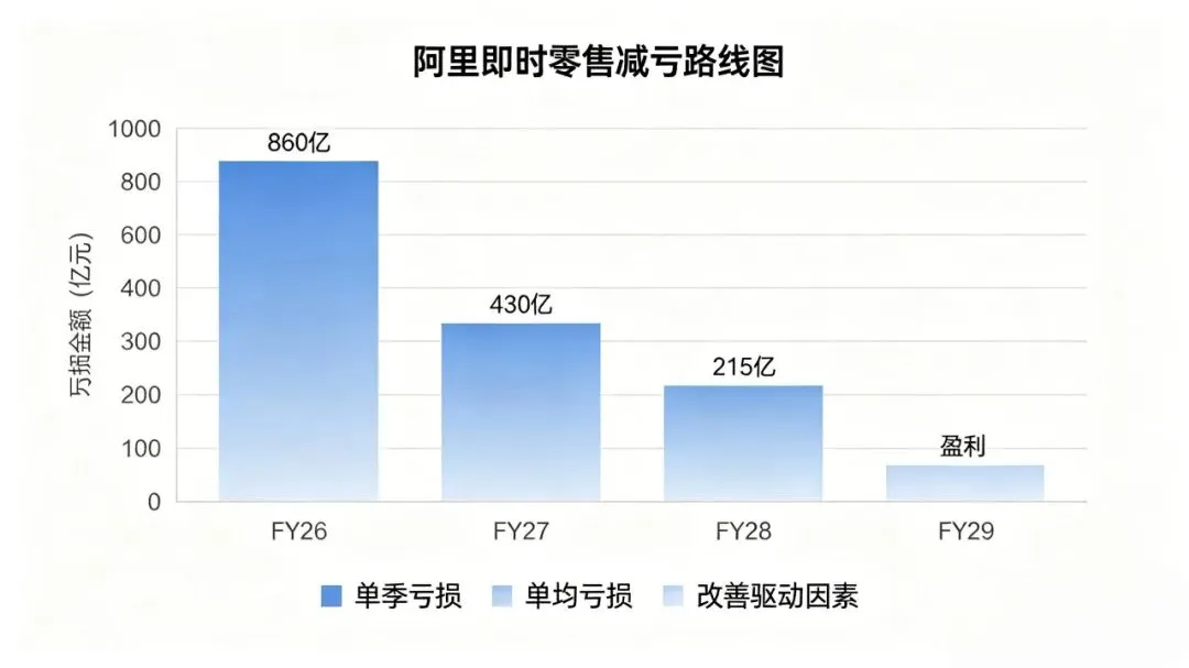 CMR:预计同比+1%(原口径+7%),主因营销费用抵减收入,货币化率保持稳定。利润:经调整EBITA同比持平,原口径利润率下滑约2pct,行业竞争仍激烈。亏损:4Q预计亏损180亿元,FY26全年约860亿元。减亏路线:FY27、FY28每年减亏50%,FY29实现盈利。订单结构优化:高AOV订单占比提升。