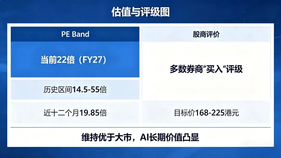 收入:FY26-FY28预测10288/11517/13092亿元(-0.5%/-1.2%/-0.7%)。经调整EBITA:FY26-FY28757/993/1343亿元(-10%/-19%/-15%),反映AI高投入。经调整净利润:FY26-FY28746/1018/1374亿元(-6%/-4%/+2%),股权投资(含模型厂商)部分对冲利润下滑。估值:当前对应FY27PE22倍,维持“优于大市”评级。五、投资看点与风险