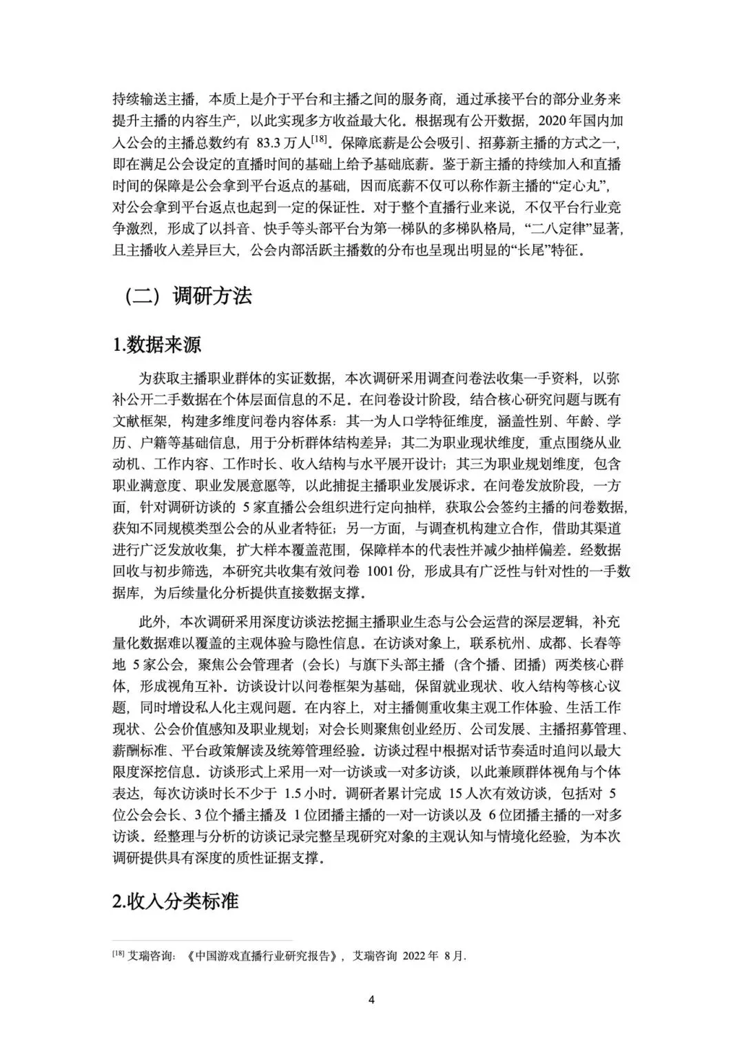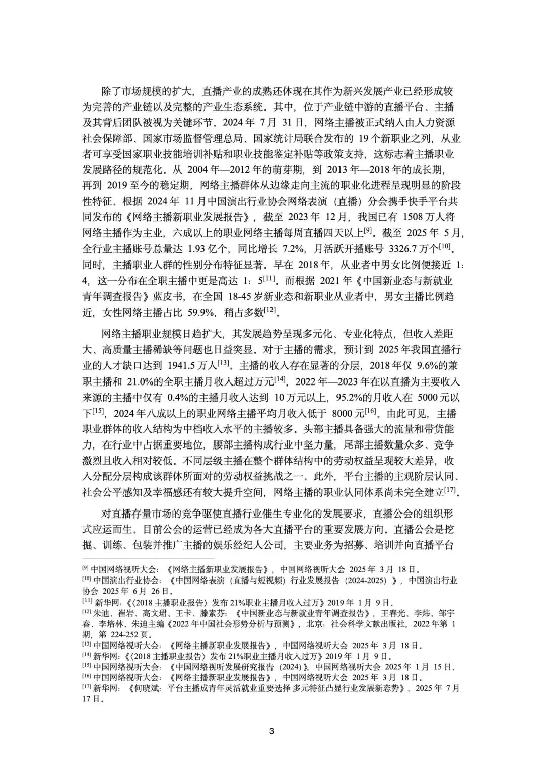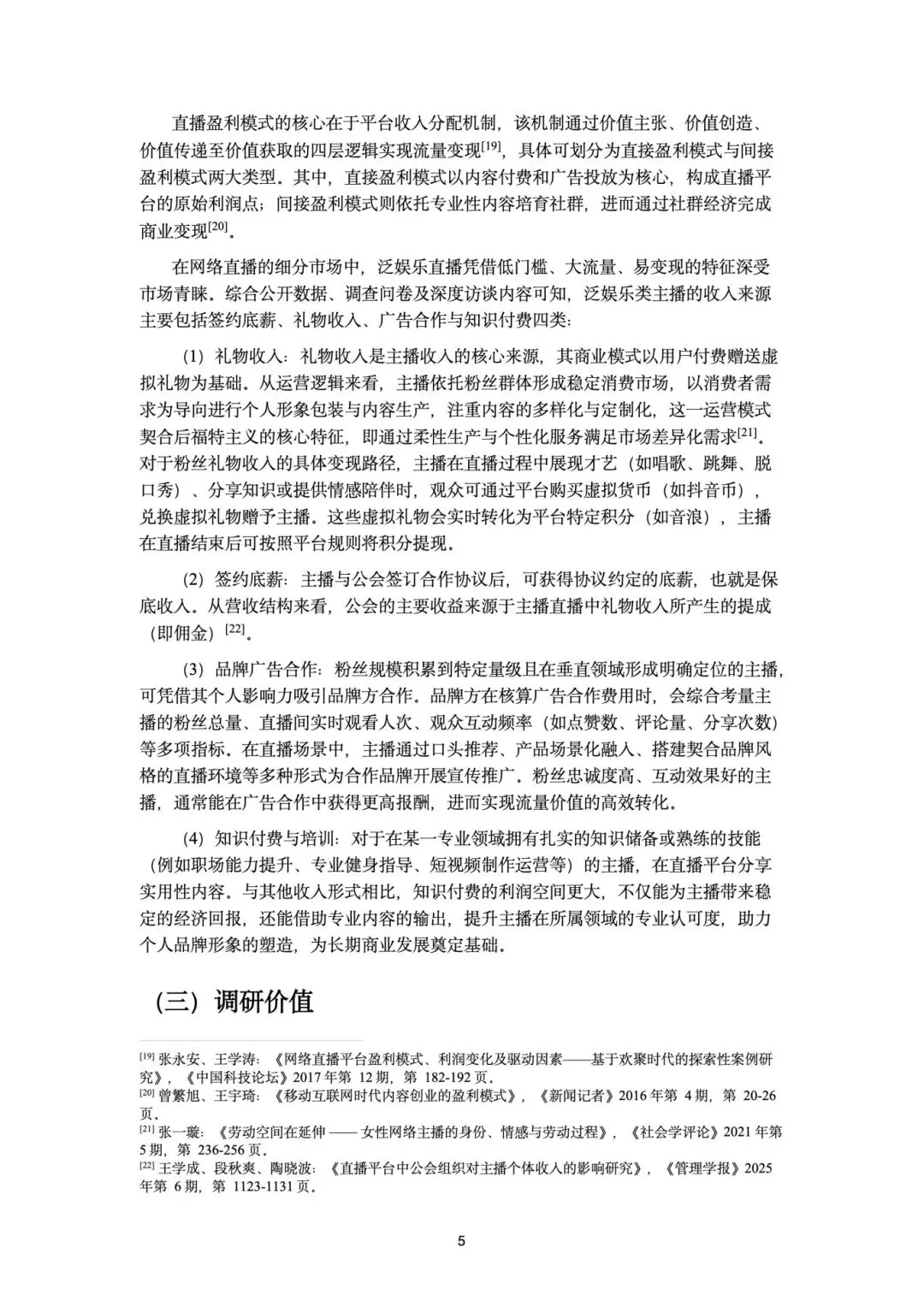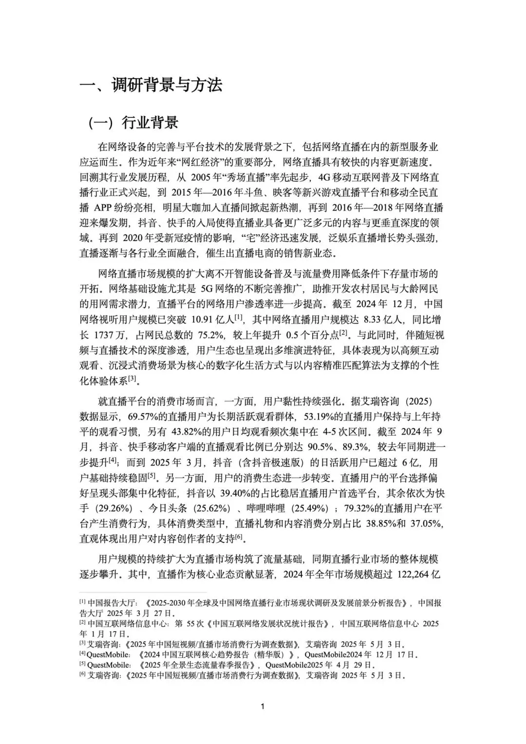 本报告基于 1001 份有效问卷与 15 人次深度访谈,系统刻画抖音主播群体画像、收入结构、工作模式与职业发展现状。主播已成为国家认定新职业,行业从野蛮生长转向规范化、职业化,呈现年轻化、高学历、兼职为主、收入中等特征,收入高度分层,公会与平台规则、个人能力、粉丝运营共同决定职业成败。