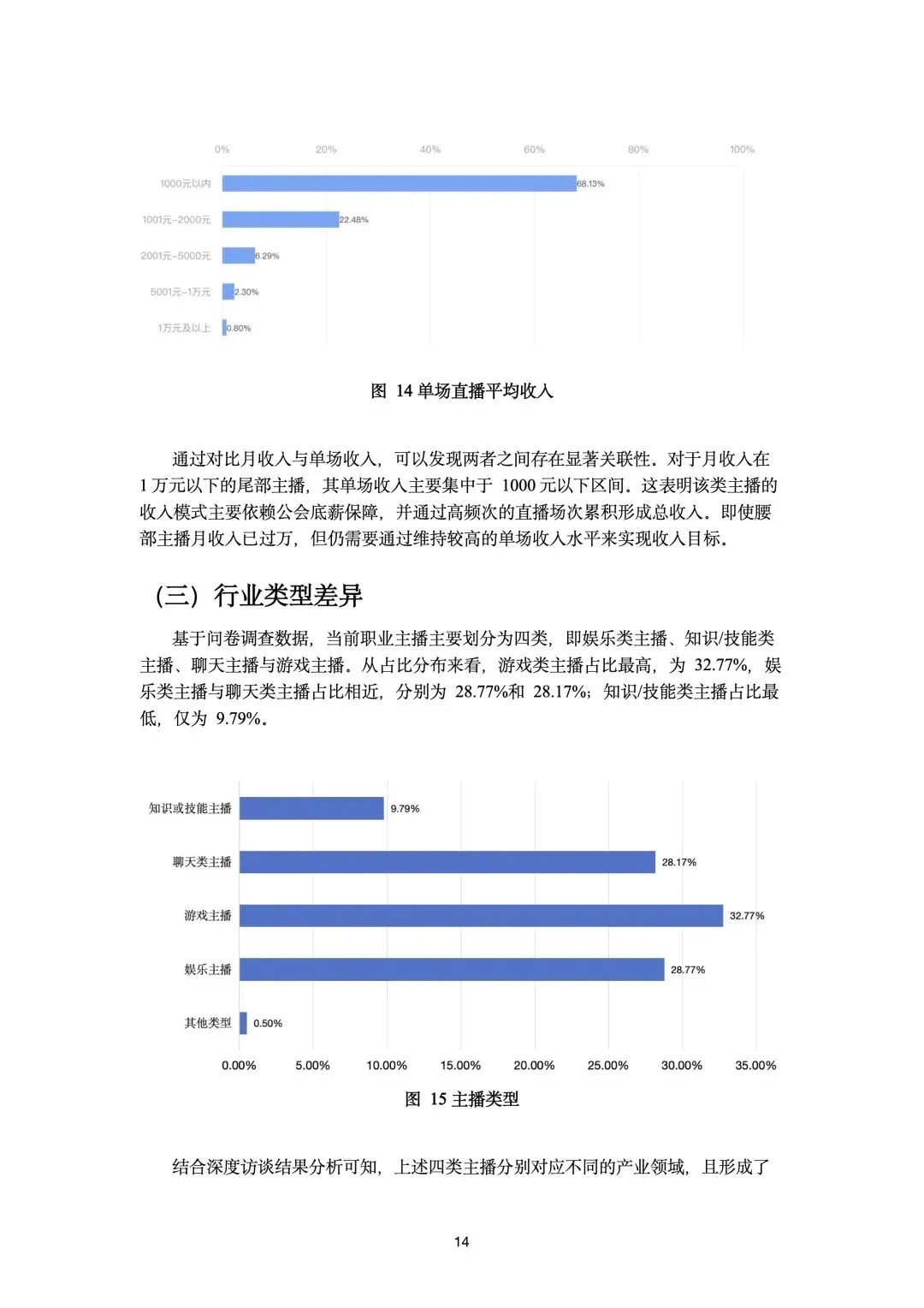 主播月收入呈现典型金字塔结构,19.49% 破万,3.4% 达 3 万以上;66% 集中在 2000-10000 元中等区间。92% 签约主播可获公会底薪,70% 底薪在 5000 元以下,以兜底为主。单场收入超 90% 不足 2000 元,收入依赖高频次直播累积,行业并非大众印象中的 “高收入暴利”,而是稳定中等收入职业。 - 赛道与模式差异:游戏 / 娱乐 / 聊天为主,个播与团播逻辑完全不同