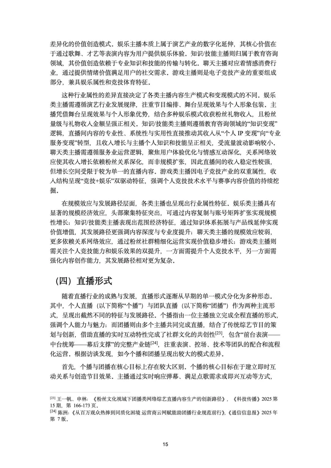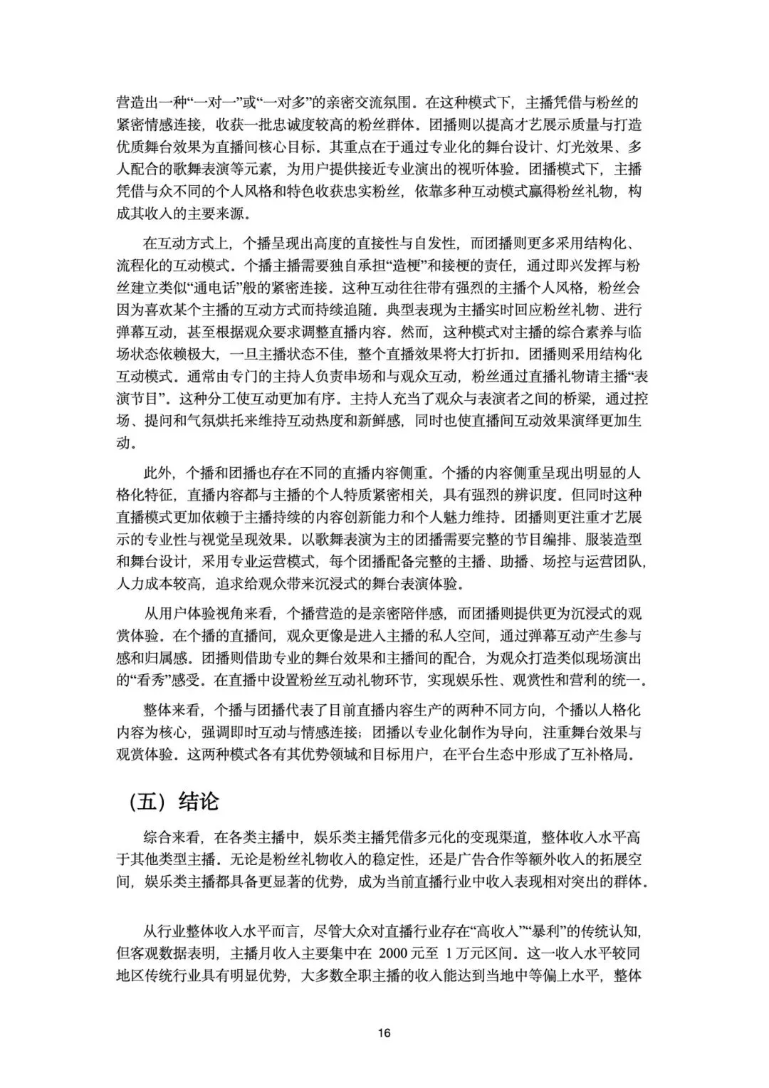 主播以游戏(32.77%)、娱乐(28.77%)、聊天(28.17%)为主,知识技能类仅 9.79%。娱乐主播收入结构最多元,知识主播溢价更高。个播侧重人格化、即时互动与情感连接;团播走专业化舞台化路线,强调编排、团队配合与视听体验。两种模式互补,分别对应陪伴需求与观赏需求。 - 收入五大核心影响因素:平台规则、个人能力、工作细节、粉丝运营、外部环境