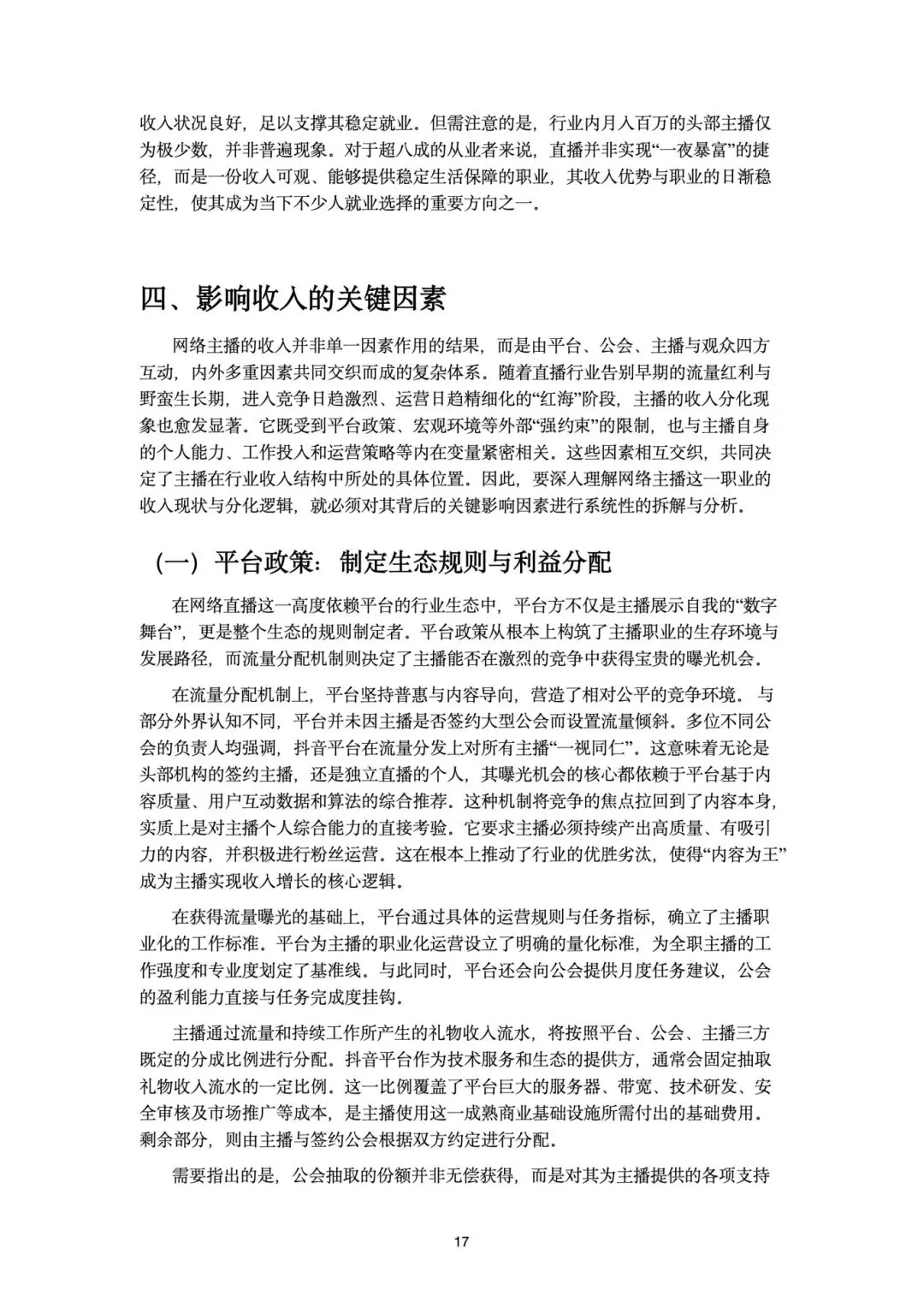 平台算法以内容为核心分配流量,分成规则明确;个人能力中情商、内容创作、颜值、勤奋决定转化效率;直播时段、时长、频次、策划度直接影响流量与收入;粉丝维护与在线人数决定基本盘;政策监管净化行业,经济与竞争环境抬高入行门槛,多重因素共同造成收入分化。 - 职业发展与行业建议:走向专业化,需监管、平台、从业者协同规范
