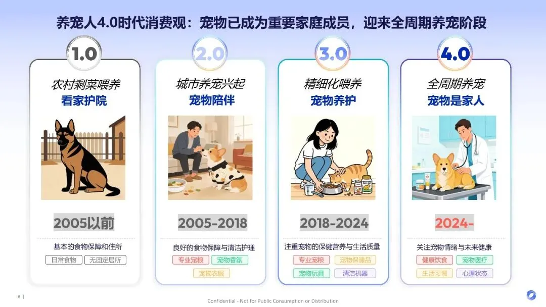 健康养护意识达到前所未有的程度:宠物体检需求急剧增加,专用保健品比如针对关节、泌尿、心脏方面的需求也大幅增长,适老产品需求同样猛增,目的在于凭借科学手段去延长宠物的健康寿命。