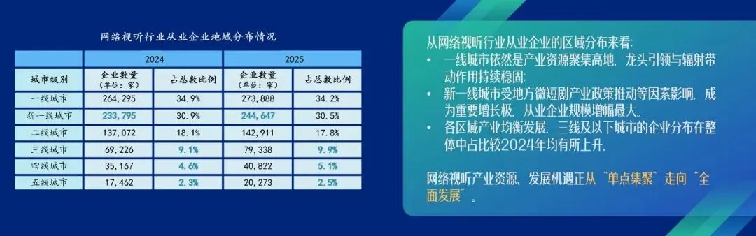 一线城市依然是产业资源聚集高地,龙头引领与辐射带动作用稳固;新一线城市在地方微短剧产业政策等因素的推动下,从业企业规模增幅最为显著。三线及以下城市的企业分布在整体中占比较2024年均有所上升,网络视听产业资源、发展机遇正从“单点集聚”走向“全面发展”。