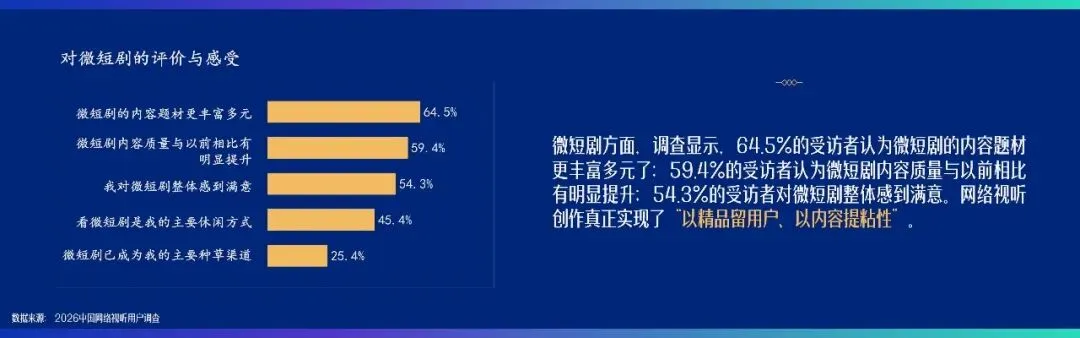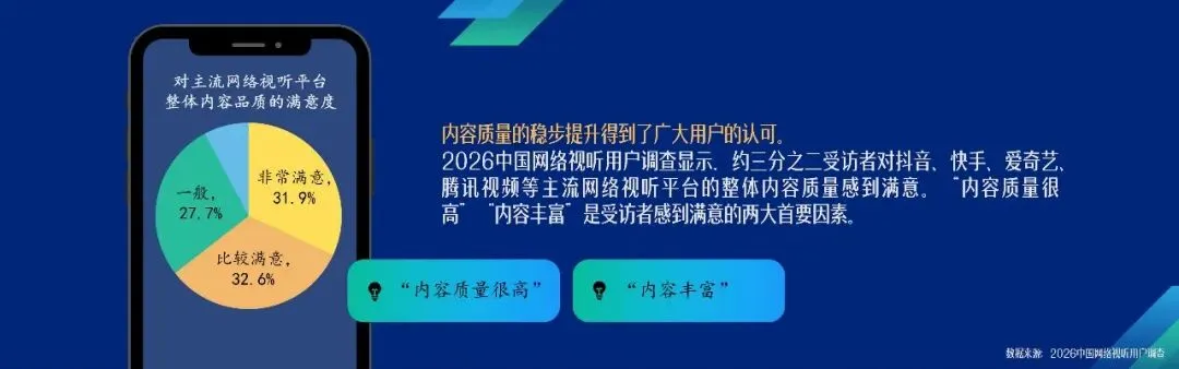 内容质量的提升赢得了广大用户的认可。据调查,64.5%的受访者对视听内容感到满意,“内容质量很高”“内容丰富”是满意的两大首要因素。