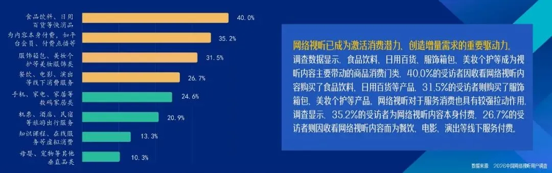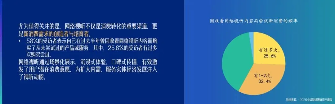 网络视听已成为激活消费潜力、创造增量需求的重要驱动力。数据显示,58%的受访者在过去半年内因收看网络视听内容,购买了此前从未尝试过的产品或服务,其中25.6%的受访者有过多次购买经历。