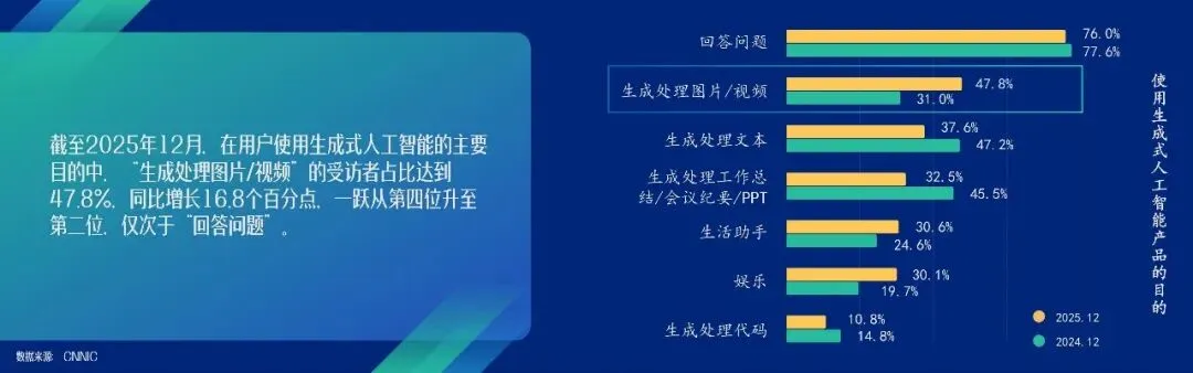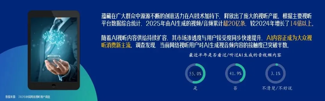 生成式人工智能技术的进步催生出的“人机协同”生产模式,正从创新探索转变为行业“标配”,深刻重塑了视听内容生产体系,释放出了庞大的视听产能。2025年由AI生成的视频/音频累计超20亿条,较2024年增长了14倍以上。