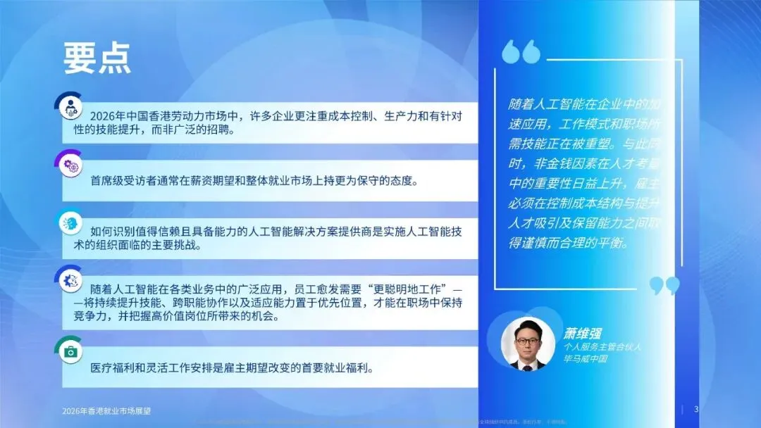 随着人工智能在企业中的加速应用,工作模式和职场所需技能正在被重塑。与此同时,非金钱因素在人才考量中的重要性日益上升,雇主必须在控制成本结构与提升人才吸引及保留能力之间取得谨慎而合理的平衡
