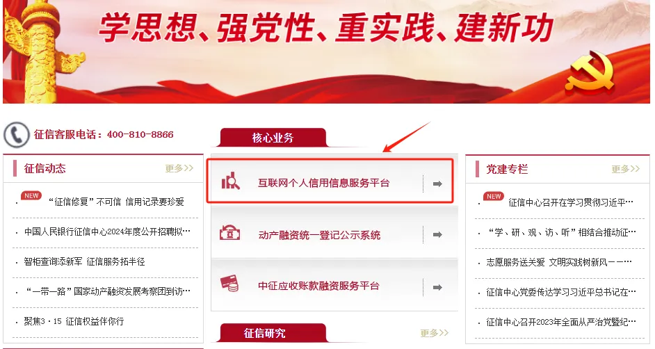 第二步:进入网站后,在“核心业务”处找到“互联网个人信用信息服务平台”点击进入。【复制上方网址进入的朋友们可以跳过这一步】