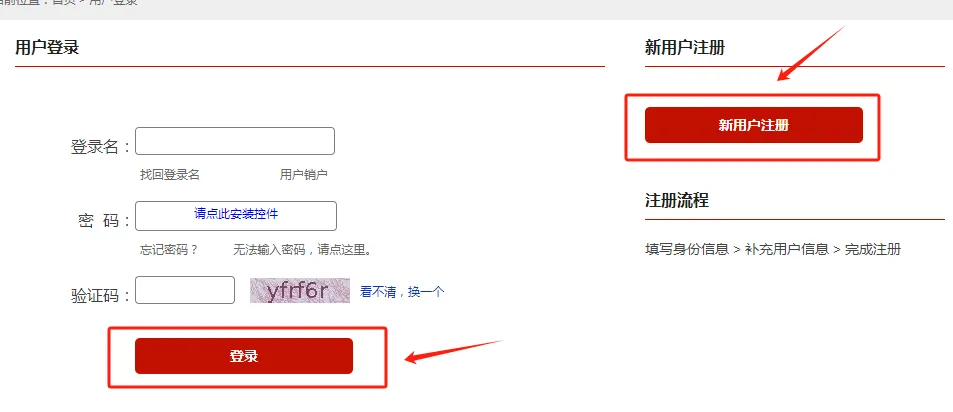 第四步:在登录页面输入登录名、密码和验证码即可登录。如果还没有注册的话,就点击“新用户注册”去完成注册再进行登录。