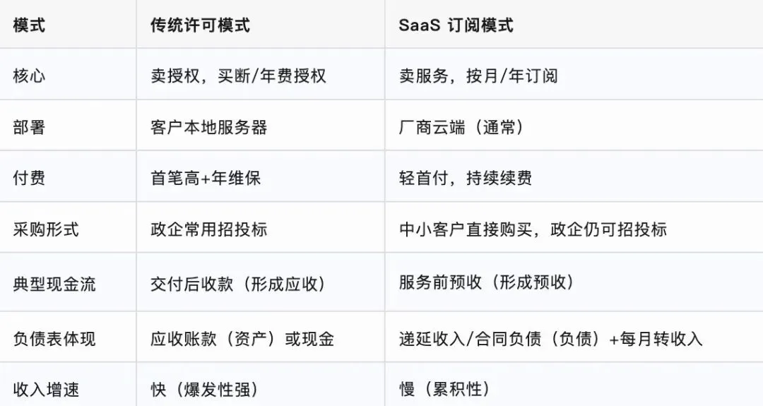 资产负债表是观察SaaS企业商业模式本质的最佳窗口。这类企业最显著的特征是先收钱、后服务,因此在资产端往往呈现出与传统制造业截然不同的景象。合同负债(Contract Liabilities)是首要关注指标。 这一科目代表企业已收到但尚未履行的服务义务,实质上是未来的"收入储备"。分析时应当观察三个维度:绝对值的年度变动趋势,判断业务是否在扩张;合同负债与营收的比率,持续上升意味着客户粘性增强、商业模式趋于稳定;以及结构分析,区分一年内到期的短期预收和长期预收,后者占比越高,说明收入确认的可持续性越强。货币资金的管理策略则揭示了企业的战略意图。SaaS作为轻资产行业,账上通常保有大量现金用于研发投入或潜在并购。关键问题在于:这些现金是准备回馈股东(分红或回购),还是投入重大战略项目(如自研大模型)?现金储备的充裕度与资金用途的匹配性,考验管理层的资本配置能力。对于通过并购扩张的SaaS企业,商誉与无形资产是风险高发区。当商誉占总资产比例超过30%时,需要高度警惕减值风险。投资者应关注收购的技术资产和客户资源是否产生了预期的协同效应,还是成为拖累业绩的"减值炸弹"。此外,资本化研发支出的会计处理策略是否激进,也直接影响利润表的质量。应收账款是SaaS财报中的异常信号探测器。 理论上,订阅制模式下预收款应占主导,应收账款极低。若该科目异常增长,往往意味着两种可能:一是企业的订阅制转型并不彻底,仍在依赖传统许可模式(详见下表);二是大客户账期恶化,议价能力下滑,这对商业模式健康度构成严重威胁。常见误区:SaaS 订阅模式下,预收账款/合同负债始终是正数负债,反映企业未来需履行的服务义务;相关收入不会计入收款当期利润表,而是在服务提供期间分期确认,这既符合会计准则要求,也准确反映了 SaaS 业务 "持续提供价值" 的商业本质。 预收订阅费 = 当期收入 ❌ 收入确认以履约进度为依据,而非收款时间 合同负债是资产 ❌ 它代表 "未履行的服务承诺",属于负债 负数合同负债=亏损 ❌ 负数通常是账务错误,需核查并调整SaaS企业通常享有令人羡慕的高毛利率(健康区间在75%-90%),但高毛利并不意味着高利润。真正的考验在于三项费用的控制。研发费用率(R&D Ratio)是生命线指标,通常维持在15%-30%之间。进入2025年,AI投入成为新的观察焦点:AI研发支出是否过度稀释了短期利润?更重要的是,这些AI功能是否真正转化为ARPU(每用户平均收入)的提升?如果只是为追热点而盲目投入,将会陷入"高研发、低产出"的陷阱。销售费用率因模式而异。通用型SaaS(如办公软件)更多依赖品牌驱动和PLG(产品驱动增长),销售费用相对较低;而垂直行业SaaS(如建筑、医疗软件)往往需要地推团队和直销渠道,销售费用率较高。核心对比指标是销售费用增速与营收增速的关系——理想状态下,前者应明显低于后者,表明企业正在享受规模效应。管理费用率则是观察组织膨胀的窗口。建议关注"管理费用/员工数"这一人效指标。当企业快速扩张时,管理层级增加、行政开支上升,若该指标持续恶化,说明内部管理效率在下降。在利润质量方面,需要区分经营性利润与净利润。SaaS企业常获得政府补助或投资收益,这些非经常性损益可能掩盖主业的真实表现。此外,由于递延收入机制,当期净利润往往被"隐藏"了一部分——关注递延收入对利润的稀释程度,才能看清真实的盈利能力。然而,仅依靠利润表难以判断 SaaS 企业的真实盈利水平,现金流量表基于实际现金流入流出,更能真实反映其经营能力与盈利可持续性。对于SaaS企业,有一条核心恒等式需要检验:经营性现金流(CFO)应持续大于净利润(Net Income)这是因为预收款机制使现金流入前置,而收入确认后置。健康的SaaS企业往往呈现出"账面利润一般,但现金流充沛"的特征。在现金流结构分析中,需关注三类现金流的健康信号与危险信号:- 经营活动现金流:持续为正且显著高于净利润是健康信号;若CFO转负或大幅低于利润,表明企业可能处于行业周期底部,或预收模式受到冲击