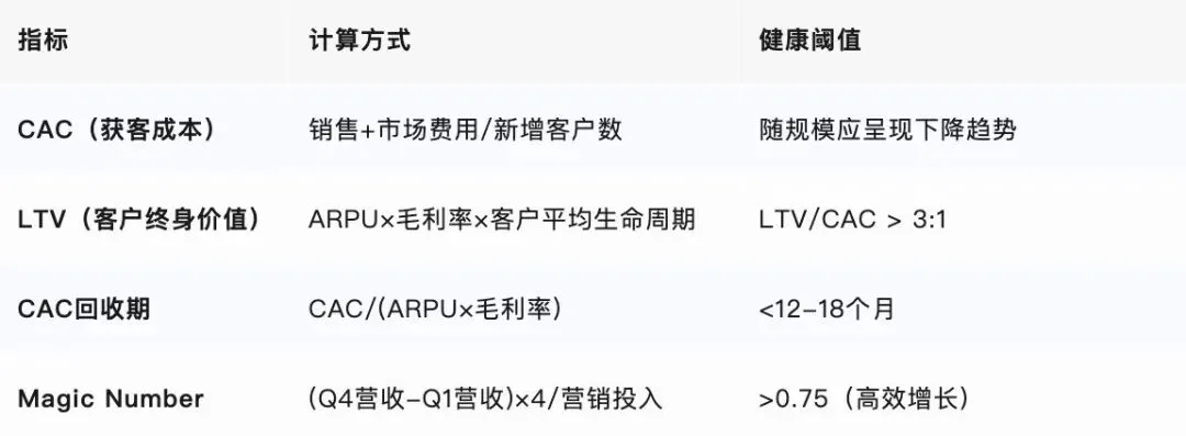 收入结构指标:除上述核心指标外,还需关注ARR增长率的构成——新客户贡献与老客扩展的比例,后者占比越高说明产品粘性越强;以及客单价分层,检查大客户收入集中度,避免对单一"鲸鱼客户"的过度依赖。