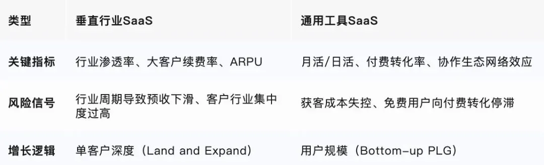 不同类型的SaaS企业,关键指标和风险信号各不相同: