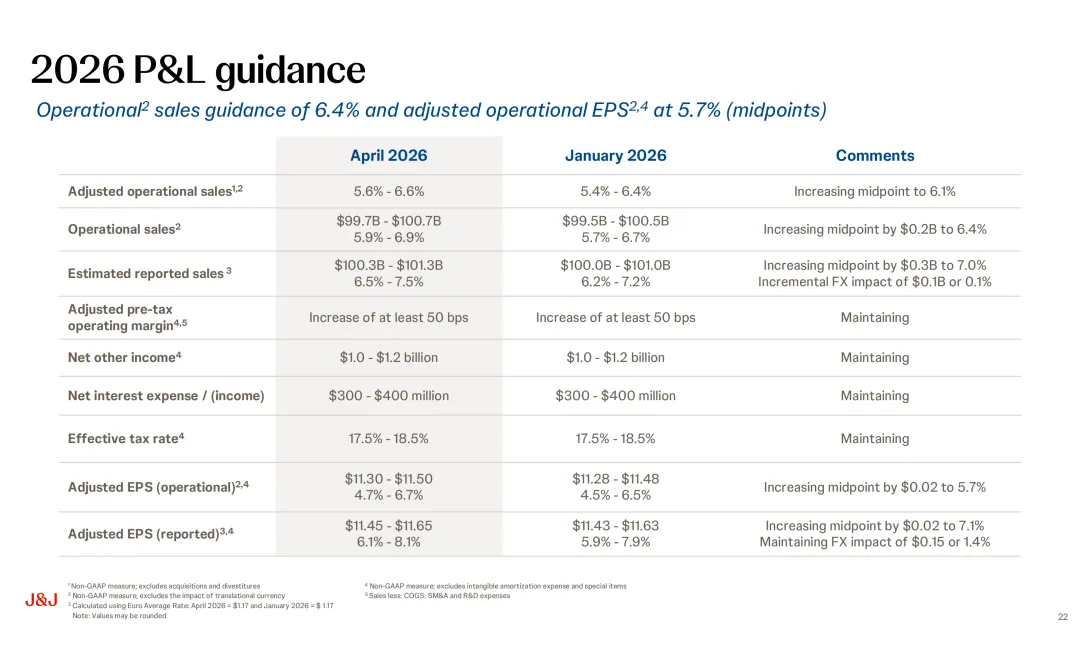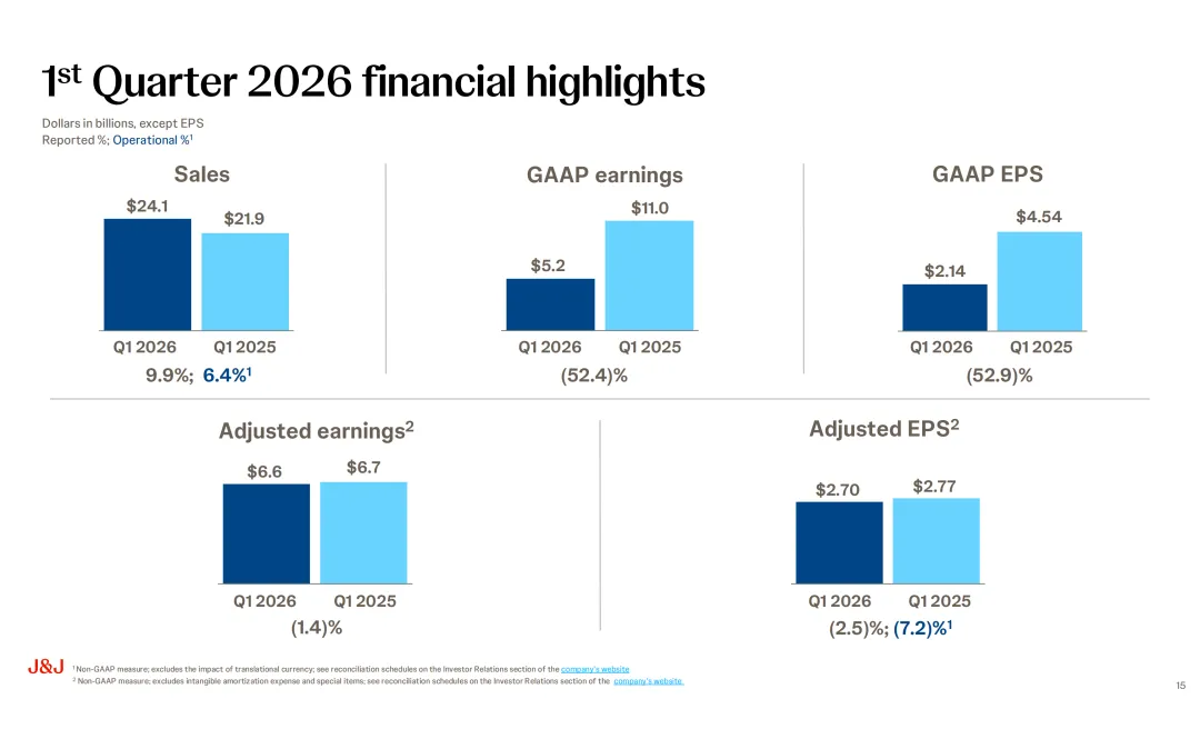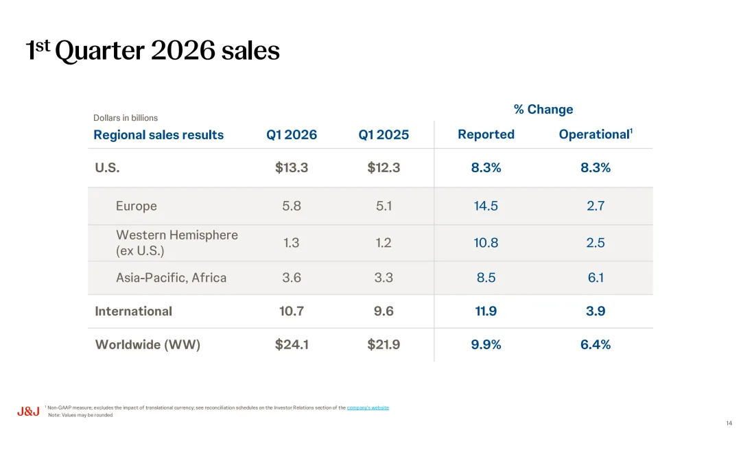 4 月 14 日,强生如期交出 2026 年第一季度成绩单。全球总销售额定格在241 亿美元,同比增长 9.9%,营运层面增长 6.4%;调整后每股收益 2.70 美元,整体表现略超市场预期,公司也顺势小幅上调了全年业绩指引。作为全球为数不多能把医药和器械两条腿都走稳的巨头,强生正站在一个格外微妙的节点 —— 一边是 Stelara 专利到期、仿制药围堵、全球医疗控费持续加压,另一边却依然稳住了增长盘面。光鲜数字背后,这家百年企业的真实成色,远比报表上的百分比更值得细品。财务盘面:营收亮眼,盈利却藏着分化