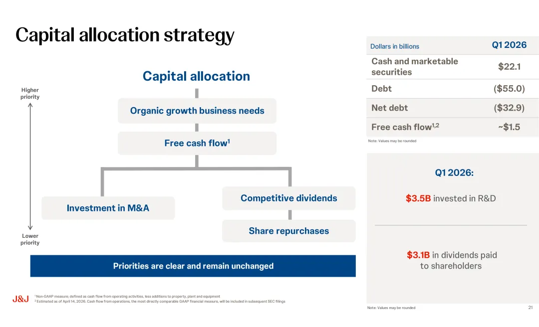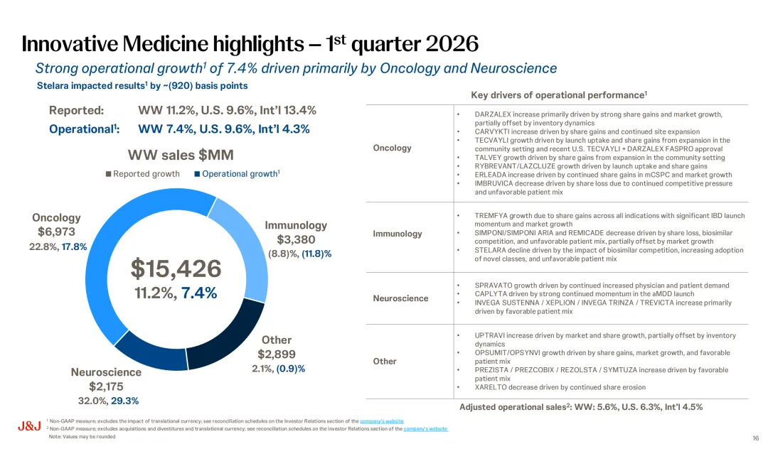 一季度整体营收的增速确实拿得出手,9.9% 的同比增幅里,汇率贡献了近 3.5 个百分点,而 Stelara 一款药就拖走了 540 个基点的增长。真正值得琢磨的是利润端。GAAP 每股收益 2.14 美元,同比大幅下滑超五成;即便剔除特殊项,调整后 EPS 也同比微降 2.5%。不难看出,强生这一季度在花钱上毫不手软,研发、市场投入同步走高,直接把盈利增速压了下去。业务板块的格局依旧清晰:创新药贡献 154.3 亿美元,同比增长 11.2%,营运增长 7.4%;医疗科技 86.4 亿美元,同比增长 7.7%,营运增长 4.6%。制药依旧是拉动增长的主引擎,医疗科技则扮演着稳健的压舱石。公司手里的现金流依旧充裕,单季自由现金流约 15 亿美元,35 亿美元砸向研发,31 亿美元用于股东分红,一边重仓未来,一边稳住投资者,节奏拿捏得相当传统。全年指引也释放出偏积极的信号,营运销售增速区间上调至 5.9%-6.9%,中点落在 6.4%,调整后 EPS 指引 11.30-11.50 美元,中点增速 5.7%。创新药:肿瘤一路高歌,免疫学疼得真切