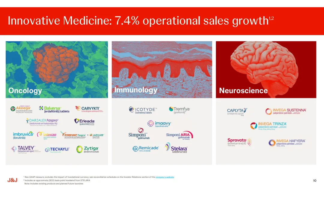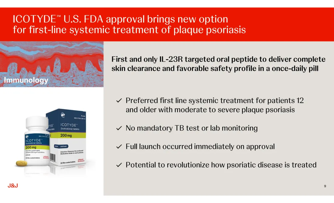 创新药板块 7.4% 的营运增长,拆开看完全是两番景象。肿瘤线几乎全线爆发。DARZALEX 凭借份额与市场的双重扩张,继续坐稳骨髓瘤领域的基本盘;和传奇生物合作的 CARVYKTI 放量速度超出不少人预期,在 BCMA 赛道里势头凶猛;TECVAYLI、TALVEY 靠着社区医院拓展和新适应症落地,快速打开市场;RYBREVANT 联合 LAZCLUZE 的肺癌组合,更是凭借差异化优势实现高速增长。唯独 IMBRUVICA 在竞争挤压和患者结构变化下持续走弱,成为肿瘤板块里为数不多的拖油瓶。真正拉低板块增速的,是免疫学的阵痛。Stelara 在生物类似药冲击下大幅下滑,单款产品就让创新药业务少了 920 个基点的增长,堪称这一季度最明显的业绩 “黑洞”。老一代产品 REMICADE、SIMPONI 也没能逃过仿制药和竞品的夹击,份额持续被蚕食。好在 TREMFYA 逆势扛起大旗,在银屑病、炎症性肠病领域疯狂抢份额,勉强撑起免疫学的门面。更让人关注的是刚获 FDA 批准的 ICOTYDE,全球首款每日一次口服 IL-23R 靶向肽,不用强制做结核筛查,也不用频繁实验室监测,上市即全面铺开,不少业内人都看好它能重新定义银屑病的治疗选择。可话说回来,一款新药的放量,真能快速填平 Stelara 留下的巨大缺口吗?恐怕没那么容易。神经科学板块反倒表现得四平八稳。SPRAVATO、CAPLYTA 靠着医生和患者端的持续认可稳步增长,INVEGA 系列长效抗精神病药凭借患者结构优化保持温和上行。倒是利伐沙班 XARELTO 渐渐步入产品生命周期尾声,份额不断被侵蚀,很难再贡献增量。医疗科技:稳字当头,政策与竞争悄悄施压