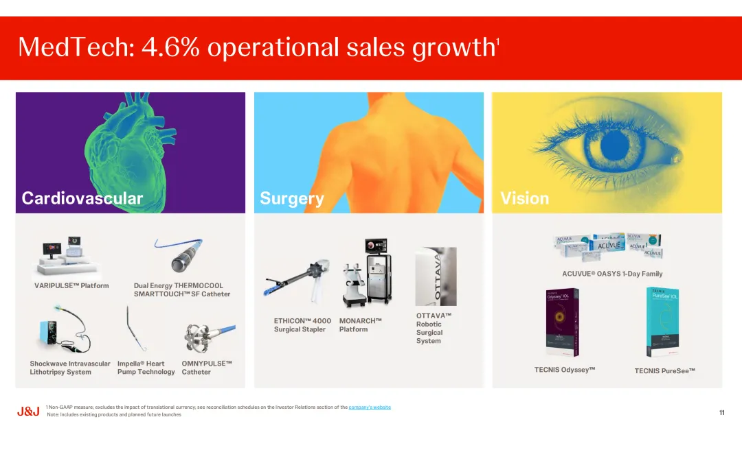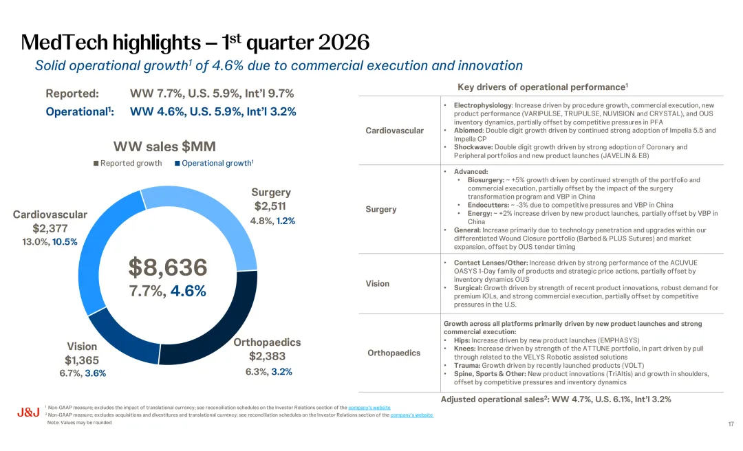 医疗科技 4.6% 的营运增长,放在全球医械行业里算得上稳健,可细看每个细分领域,压力早已渗透进来。心血管是当之无愧的增长主力。电生理业务靠着 VARIPULSE 等新品落地、手术量回升实现增长,Abiomed 的 Impella 系列、Shockwave 血管内冲击波设备都保持双位数增长,新技术的接受度正在快速提升。外科业务则呈现明显分化。生物手术稳住基本盘,腔镜切割器在竞争和中国集采双重压力下小幅下滑,能量器械靠着新品勉强微增,整体被手术转型计划和集采政策绑住了手脚。眼科靠着 ACUVUE OASYS 1 日抛系列和高端人工晶体 IOL 撑住增长,可美国市场的竞争已经越来越激烈,溢价空间正在被压缩。骨科算得上惊喜,髋、膝、创伤、脊柱全平台增长,新品和机器人辅助手术方案带动明显,只是海外招标和同质化竞争,正在一点点吃掉利润率。一个绕不开的现实是,中国市场全年还会有多轮集采,下半年力度只会更大,再叠加手术转型带来的销售逆风,医械业务后续的增速,大概率会慢慢放缓。区域增长:美国独强,国际市场靠汇率 “撑场面”