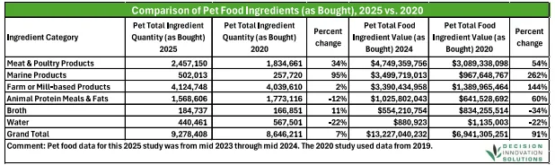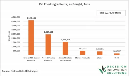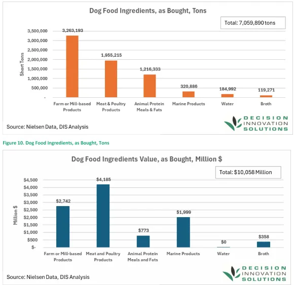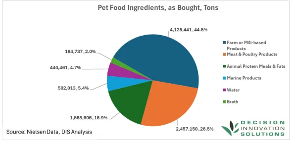 2025年(统计周期:2023年中—2024年中)美国狗猫食品生产共使用927.84万吨原料,总价值132.27亿美元。