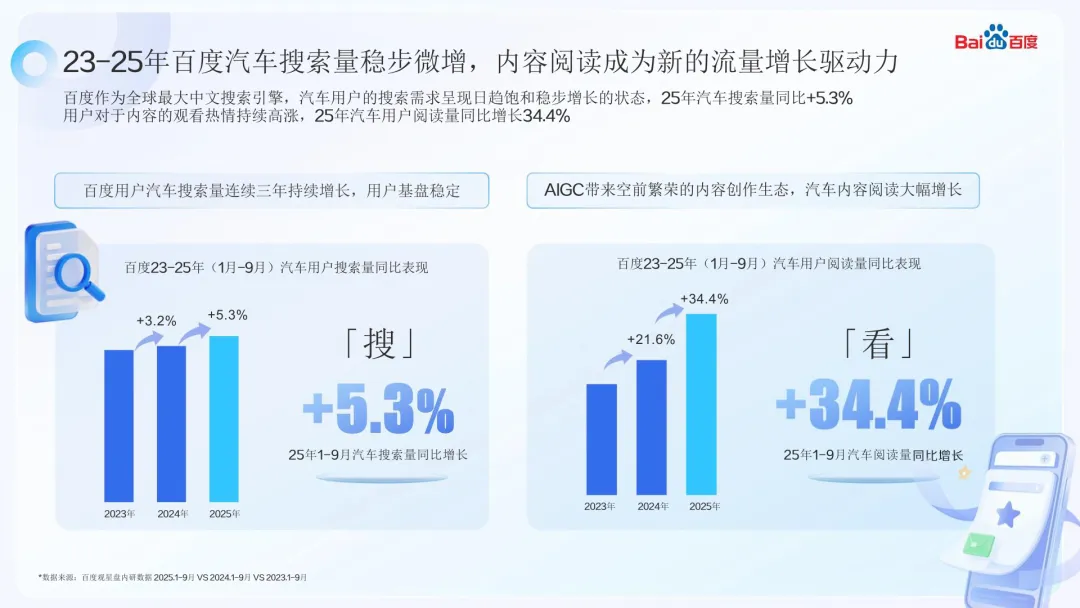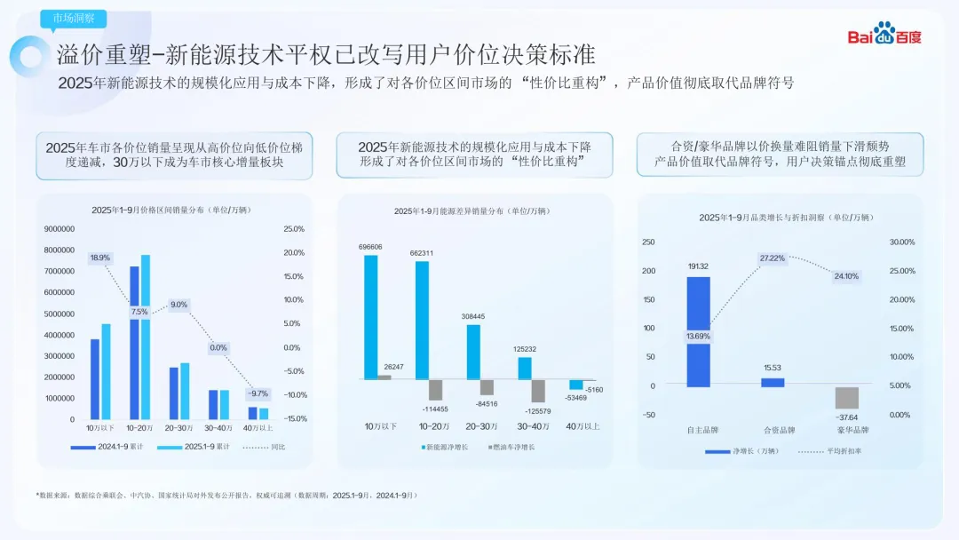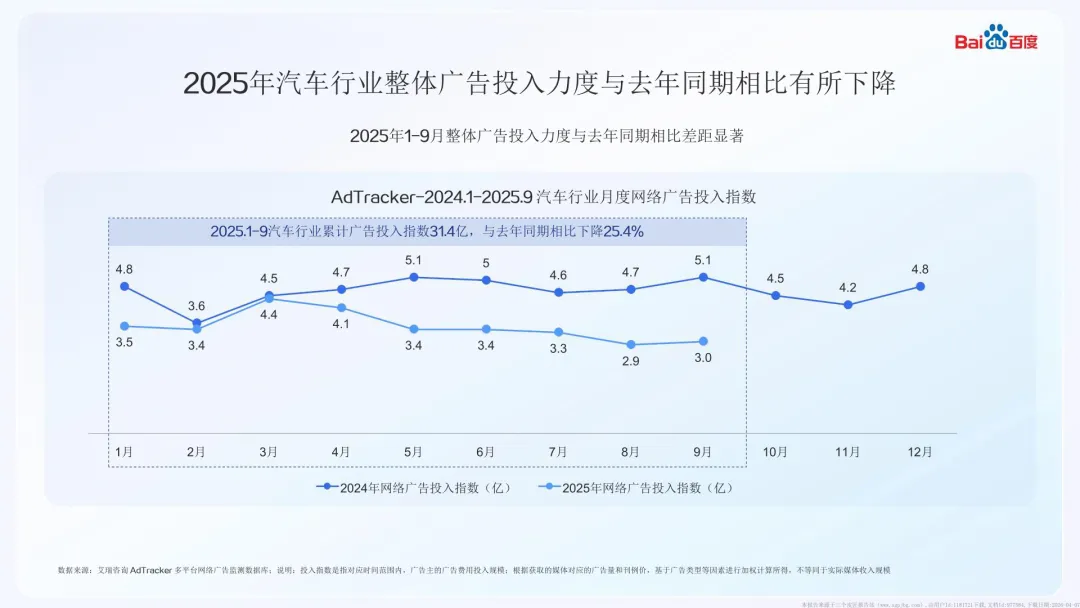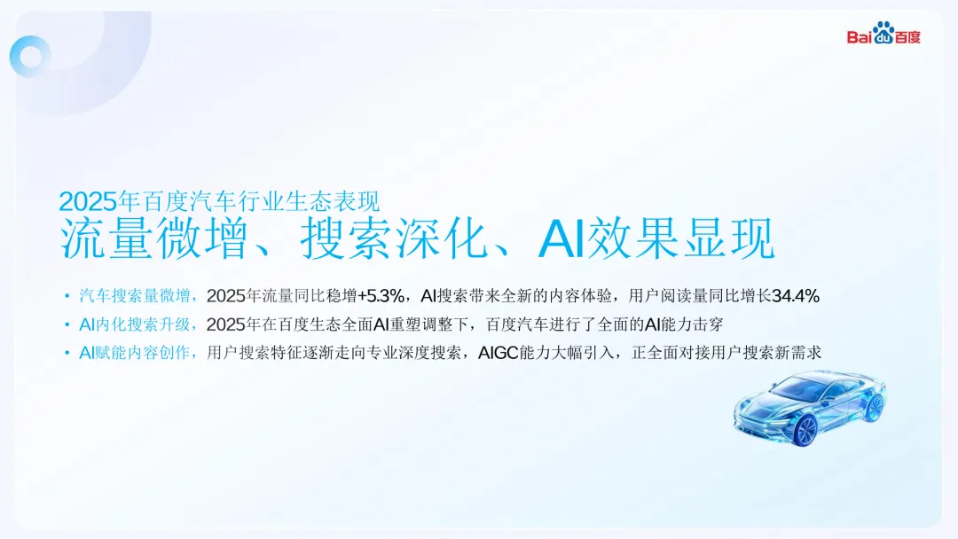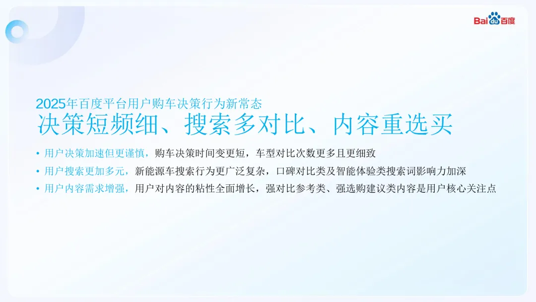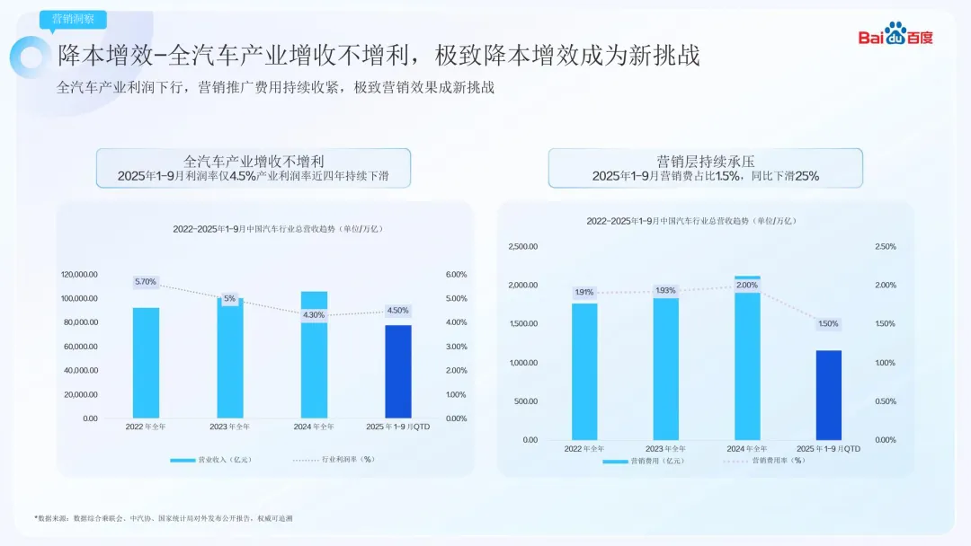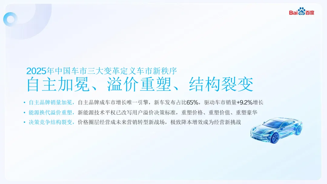 导读:2025 年百度汽车行业研究报告展现中国车市三大变革趋势。自主品牌成为市场增长核心动力,销量与新车发布量占据主导地位,推动车市整体规模稳步提升。新能源技术普及重构产品价值体系,用户决策从品牌溢价转向产品实力,三十万元以下市场成为核心增量板块。行业竞争转向价格圈层精细化运营,车企面临降本增效的经营压力。汽车营销环境呈现投入收缩与精准化转型特征。行业利润率持续下滑,营销费用占比下降,广告投放向头部车企与高价值价位段集中。百度生态凭借庞大用户基数与流量优势,在汽车广告市场保持核心地位。AI 技术全面渗透营销全流程,优化用户购车决策路径,提升线索转化与运营效率。用户购车行为呈现决策周期缩短、对比频次增加的特征。新能源车型搜索热度持续走高,智能化体验成为用户关注重点。百度依托 AI 搜索、内容生态与智能工具,打造智驱决策体系。平台通过多模态内容创作、精准人群运营、跨界场景联动,为车企提供全链路营销支撑,助力品牌把握行业转型机遇。