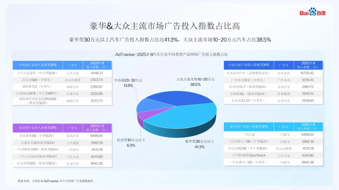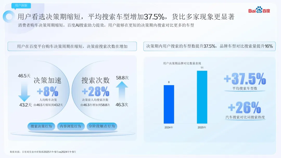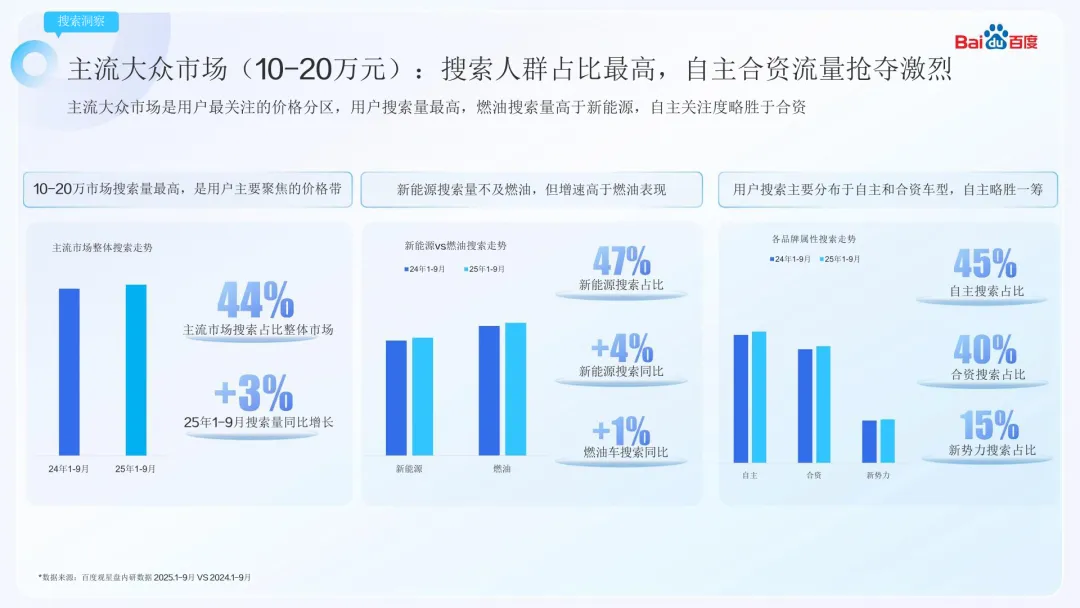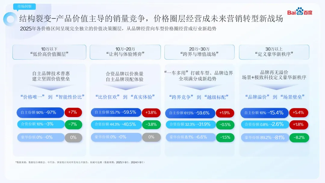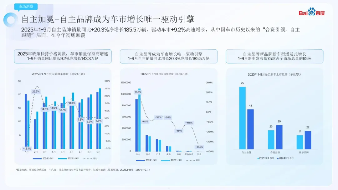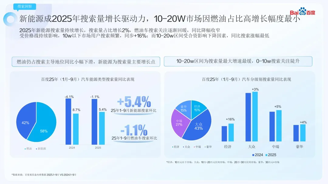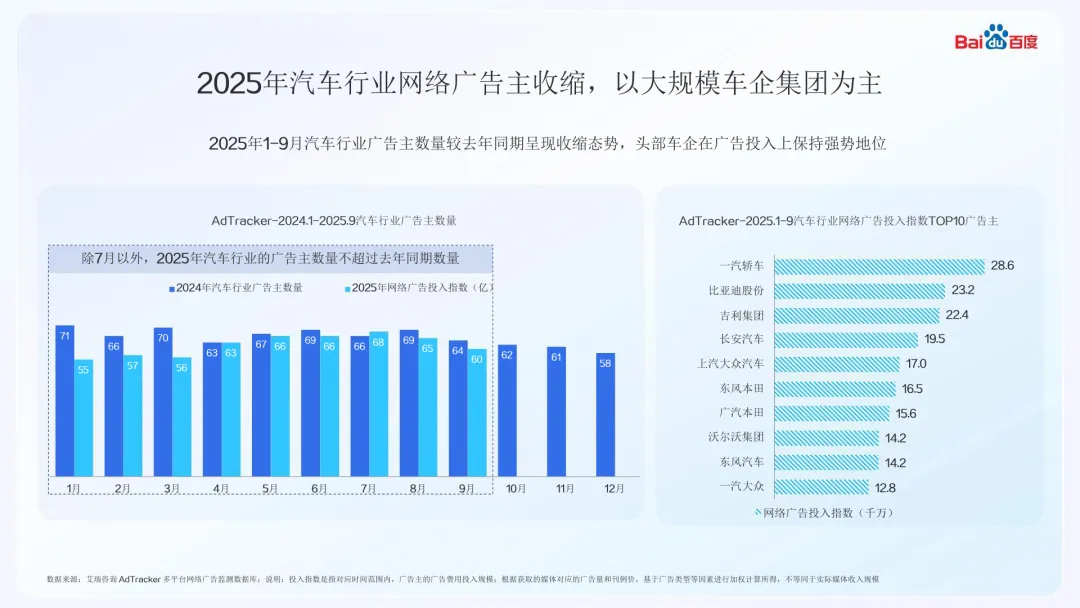 导读:2025 年百度汽车行业研究报告展现中国车市三大变革趋势。自主品牌成为市场增长核心动力,销量与新车发布量占据主导地位,推动车市整体规模稳步提升。新能源技术普及重构产品价值体系,用户决策从品牌溢价转向产品实力,三十万元以下市场成为核心增量板块。行业竞争转向价格圈层精细化运营,车企面临降本增效的经营压力。汽车营销环境呈现投入收缩与精准化转型特征。行业利润率持续下滑,营销费用占比下降,广告投放向头部车企与高价值价位段集中。百度生态凭借庞大用户基数与流量优势,在汽车广告市场保持核心地位。AI 技术全面渗透营销全流程,优化用户购车决策路径,提升线索转化与运营效率。用户购车行为呈现决策周期缩短、对比频次增加的特征。新能源车型搜索热度持续走高,智能化体验成为用户关注重点。百度依托 AI 搜索、内容生态与智能工具,打造智驱决策体系。平台通过多模态内容创作、精准人群运营、跨界场景联动,为车企提供全链路营销支撑,助力品牌把握行业转型机遇。