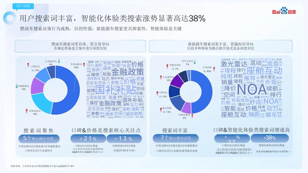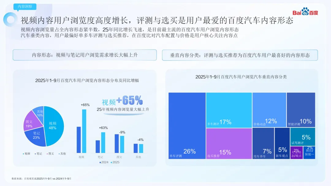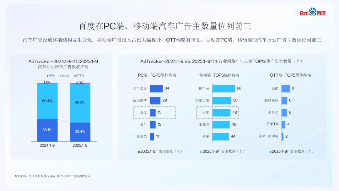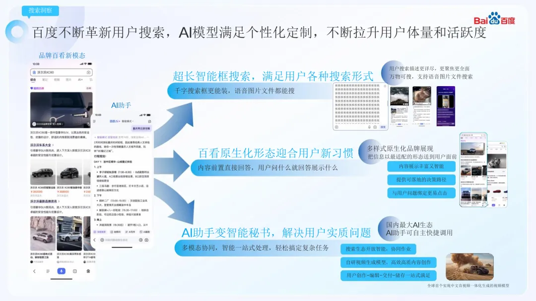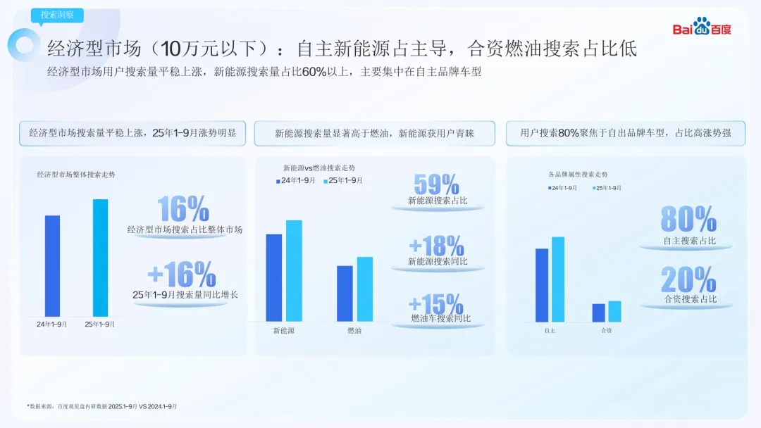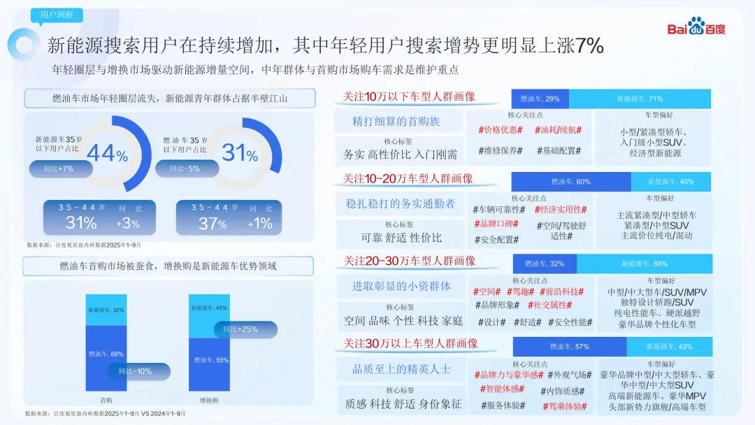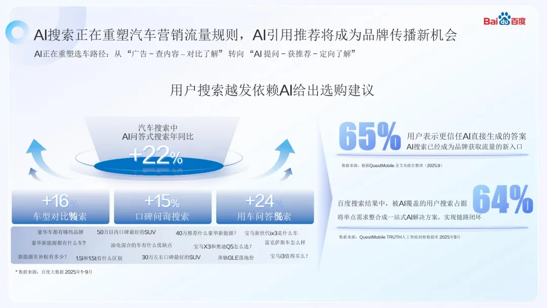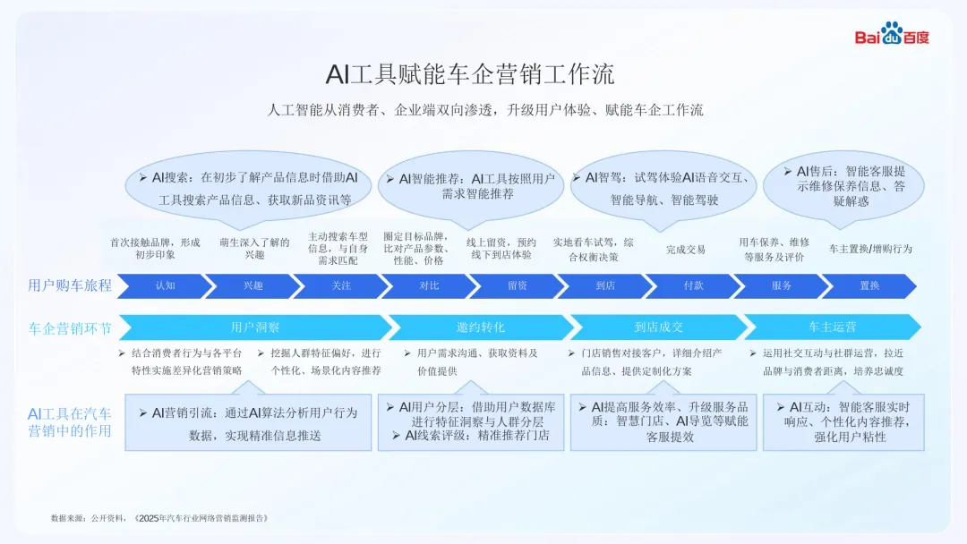 导读:2025 年百度汽车行业研究报告展现中国车市三大变革趋势。自主品牌成为市场增长核心动力,销量与新车发布量占据主导地位,推动车市整体规模稳步提升。新能源技术普及重构产品价值体系,用户决策从品牌溢价转向产品实力,三十万元以下市场成为核心增量板块。行业竞争转向价格圈层精细化运营,车企面临降本增效的经营压力。汽车营销环境呈现投入收缩与精准化转型特征。行业利润率持续下滑,营销费用占比下降,广告投放向头部车企与高价值价位段集中。百度生态凭借庞大用户基数与流量优势,在汽车广告市场保持核心地位。AI 技术全面渗透营销全流程,优化用户购车决策路径,提升线索转化与运营效率。用户购车行为呈现决策周期缩短、对比频次增加的特征。新能源车型搜索热度持续走高,智能化体验成为用户关注重点。百度依托 AI 搜索、内容生态与智能工具,打造智驱决策体系。平台通过多模态内容创作、精准人群运营、跨界场景联动,为车企提供全链路营销支撑,助力品牌把握行业转型机遇。