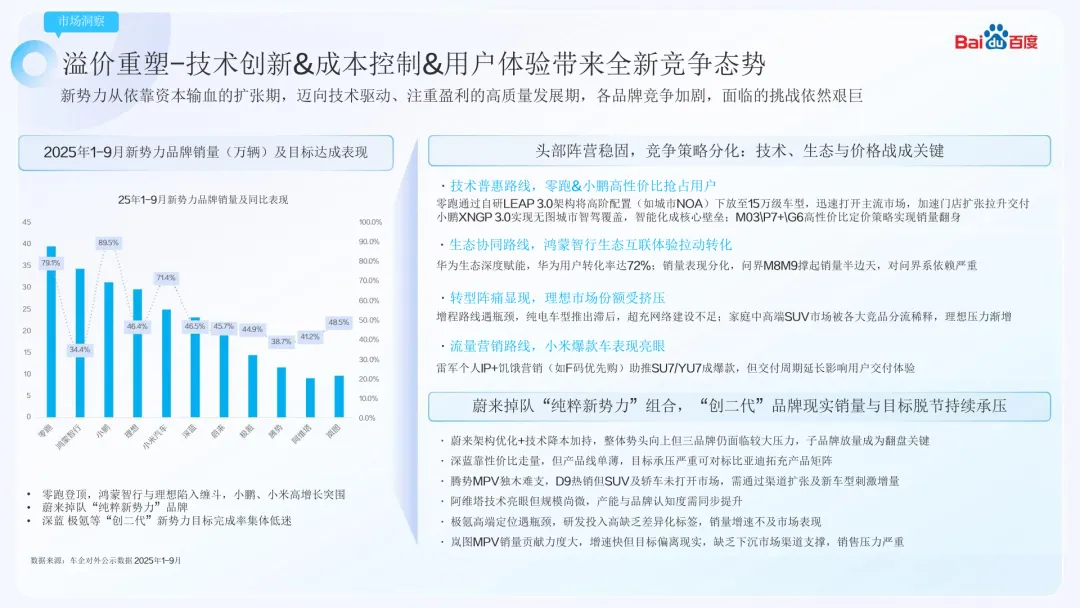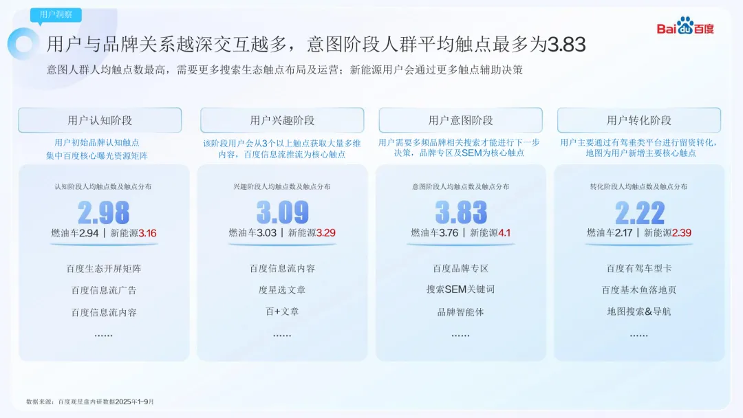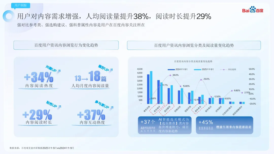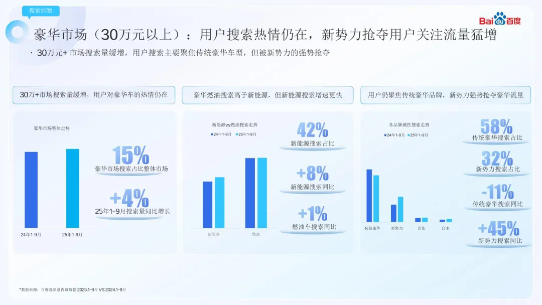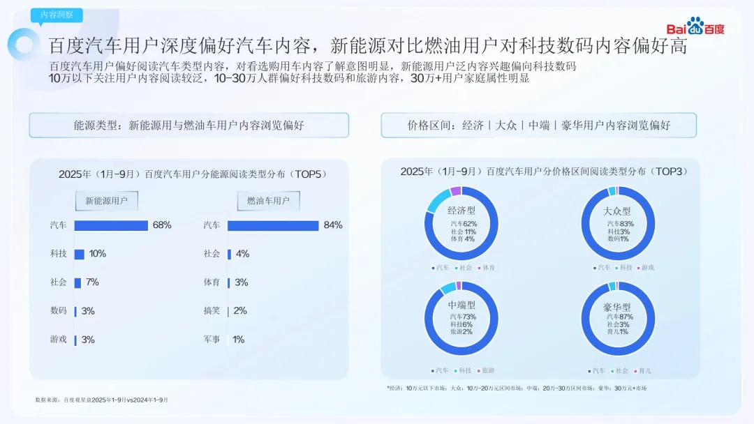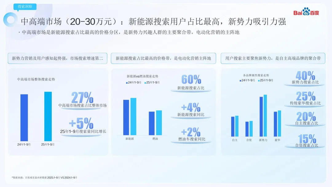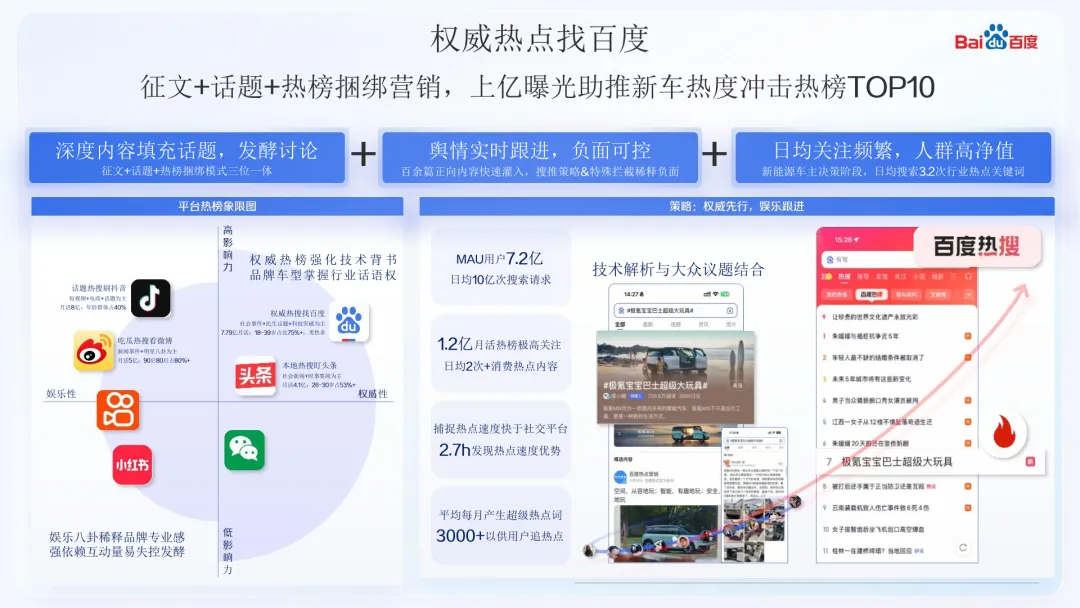 导读:2025 年百度汽车行业研究报告展现中国车市三大变革趋势。自主品牌成为市场增长核心动力,销量与新车发布量占据主导地位,推动车市整体规模稳步提升。新能源技术普及重构产品价值体系,用户决策从品牌溢价转向产品实力,三十万元以下市场成为核心增量板块。行业竞争转向价格圈层精细化运营,车企面临降本增效的经营压力。汽车营销环境呈现投入收缩与精准化转型特征。行业利润率持续下滑,营销费用占比下降,广告投放向头部车企与高价值价位段集中。百度生态凭借庞大用户基数与流量优势,在汽车广告市场保持核心地位。AI 技术全面渗透营销全流程,优化用户购车决策路径,提升线索转化与运营效率。用户购车行为呈现决策周期缩短、对比频次增加的特征。新能源车型搜索热度持续走高,智能化体验成为用户关注重点。百度依托 AI 搜索、内容生态与智能工具,打造智驱决策体系。平台通过多模态内容创作、精准人群运营、跨界场景联动,为车企提供全链路营销支撑,助力品牌把握行业转型机遇。