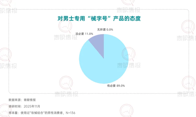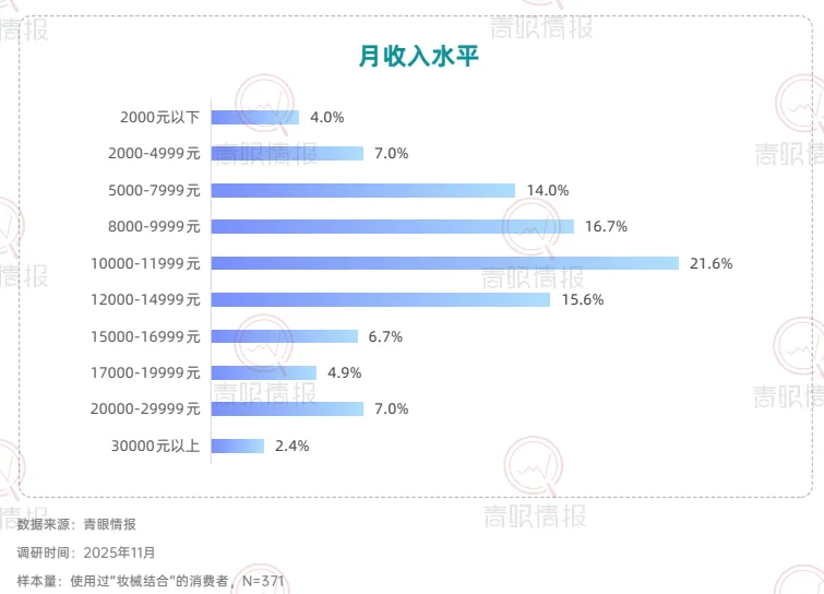 在颜值经济与科学护肤的驱动下,中国医美市场预计2025年达3700亿元,同比增长13.2%,其中,非手术类(轻医美)成为核心增长引擎,其市场份额预计将从2020年的50%稳步提升至2030年的64%。青眼情报发布的《“妆械结合”的市场发展和消费趋势洞察报告》基于消费者洞察,深度剖析了当前“妆械结合”产品的消费现状与未来发展潜力。调研数据显示,妆械结合消费者呈现明显年龄与城市分层特征。30-39岁群体占比达53.2%,为核心消费主力;25-29岁群体占比21.4%,轻熟龄人群成为妆械联合的主要消费群体。在城市分布上,一线与新一线城市合计占比61.4%,反映出该市场对医美资源密度与科学护肤认知成熟度的高度依赖。同时,这也意味着下沉市场仍存在较大的教育空间。收入方面,消费者集中于月收入8000元以上的中高收入群体,显示出具备一定经济基础、追求生活品质的都市职场人群更愿意为妆械结合产品付费,这与医美服务的消费能力高度重合。值得关注的是,尽管女性消费者仍为核心决策群体,占比63.3%,但男性占比接近40%。此外,89%的受访者认为“男士专用械字号产品”具有必要性,表明男性“械字号”虽非主流产品,但市场潜力较大。