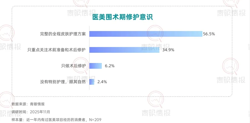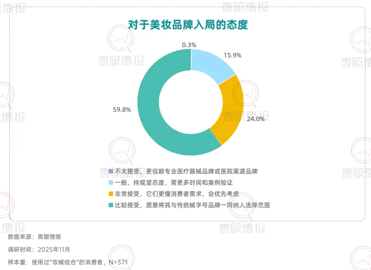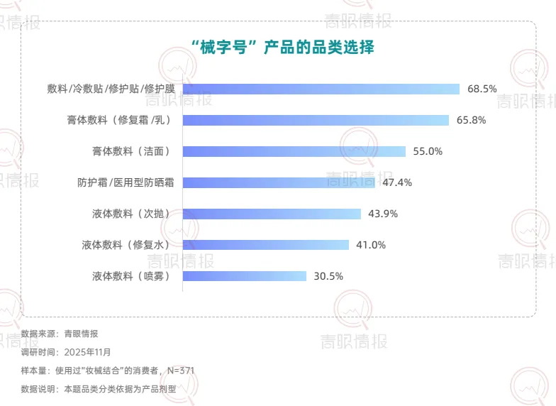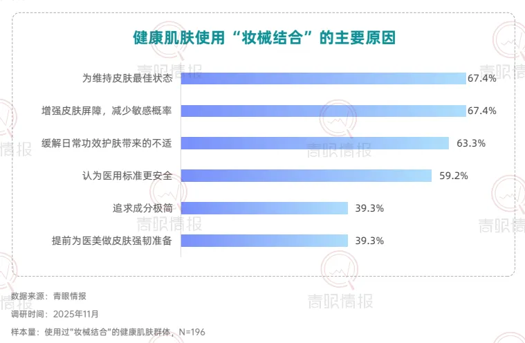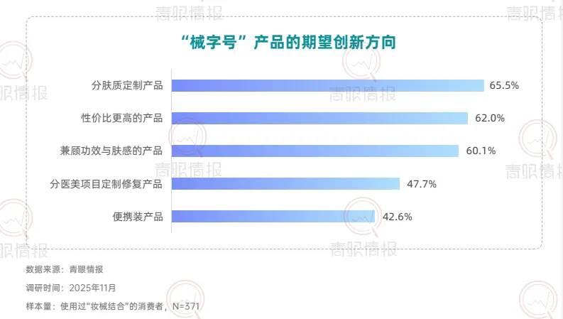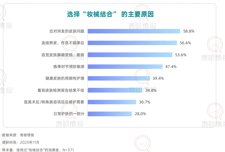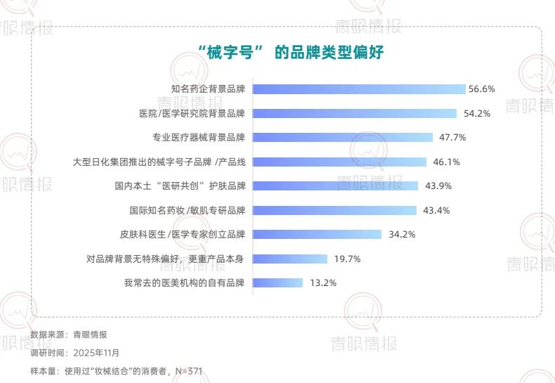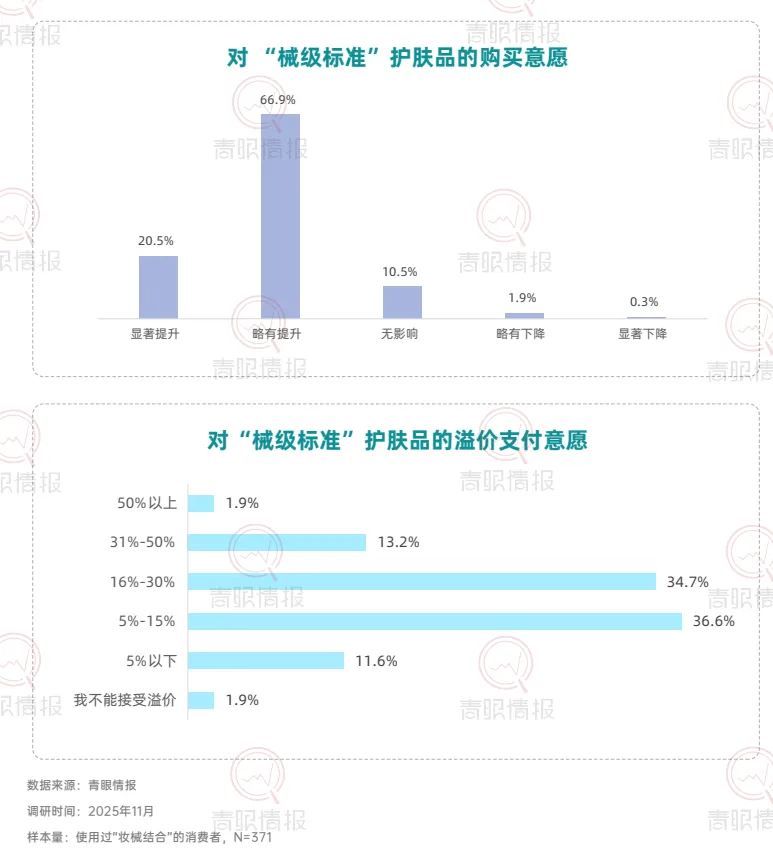 从市场认知层面来看,目前仅37.4%的消费者知晓“妆械结合”概念,但72.7%的知晓者已转化为使用者,且近四分之一的用户还是“经常使用”的高粘性用户,这说明妆械结合市场教育率有待提高,但消费者一旦形成认知,便展现出极强的转化意愿与复购黏性。在医美围术期,消费者对于“妆械结合”的产品需求由术后修护转向全周期的皮肤管理方案。数据显示,56.5%的消费者希望获得“完整的全程皮肤护理方案”,而仅关注“术后修护”的比例仅为6.2%。在医美围术期外,近六成消费者将其作为应对突发皮肤问题的急救方案,56.6%用于连续熬夜后的护理,超过半数用于自我感知的屏障修复。此外,换季防护、周期性护理等日常维养场景同样占据重要地位。健康肌肤人群亦通过周期性使用,将妆械结合纳入日常护肤体系。67.4%的消费者表示使用妆械结合是为了“维持皮肤最佳状态”;超六成消费者希望“增强屏障、减少敏感概率”或缓解日常功效护肤带来的不适。这意味着,械字号产品正从“治疗工具”转变为日常护肤体系中的“安全垫”与“功效放大器”。在具体使用方式上,穿插式护肤成为主流。39.6%选择“先妆后械”以强化修护,26.9%选择“先械后妆”以打底防护,23.2%采用早晚分时使用。品类选择上,修复霜/乳以68.5%的占比位列第一,械字号洁面与医用型防晒紧随其后,显示日间防护场景正被械字号产品快速渗透。在产品创新层面,有六成消费者期望出现更多分肤定制的械字号产品,同样有六成消费者期待性价比更高的产品与兼顾功效与肤感的产品。此外,47.7%的消费者希望出现“分医美项目定制修复产品”,42.6%期待便携装产品。这表明,消费者不仅追求更合理的价格与使用愉悦感,也在功能深度与使用便利性上对产品提出了更高要求。在使用过妆械结合的消费者中,超过八成对美妆品牌进入该赛道持接受态度,其中近六成愿意将其与传统品牌一同纳入考量,24.0%表示“非常接受并优先考虑”,凸显消费者对于美妆品牌入局的接纳和妆械同源的认可。具备专业背书的品牌更易获得消费者青睐。超五成消费者会选择具有知名药企背景或医院/医学研究院背景的品牌;本土“医研共创”品牌与国际知名药妆/敏肌专研品牌亦获得超过四成消费者的选择。这表明,消费者对械字号产品的信任更多建立于品牌的专业背景之上,“妆械同源”的品牌同样在信任范畴之内。数据显示,87.4%的消费者表示,对“械级标准”护肤品(指宣称按照“械字号”产品管理规范(《医疗器械监督管理条例》《医疗器械生产监督管理办法》等有关法规)所研发和生产的“妆字号”产品)的购买意愿会因此提升,进一步印证“医用级信任”注入美妆赛道所产生的市场拉力。此外,超过85%的消费者接受“械级标准”护肤品5%至30%的溢价,其中5%-15%与16%-30%构成核心溢价区间,界定了消费者心中的“溢价锚点带”。这说明,消费者愿意为其所感知到的更高安全标准、更精简配方与更严谨的生产工艺支付额外费用。结语:妆械结合正从细分赛道走向主流护肤体系的核心地带。消费者认知的深化、使用场景的拓展以及品牌专业背书的强化,共同推动这一市场迈向成熟。点击卡片获取完整版《“妆械结合”的市场发展和消费趋势洞察报告》