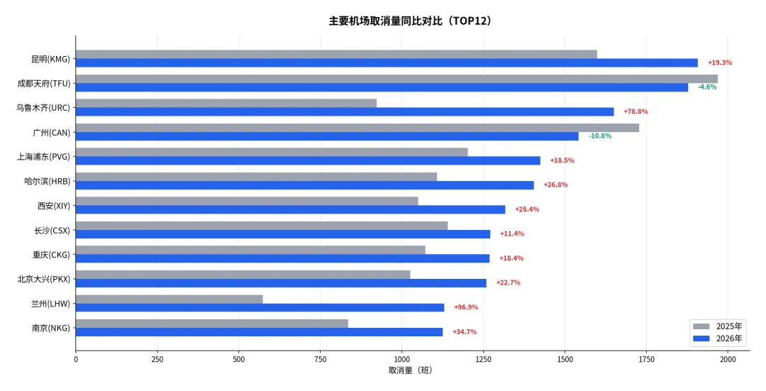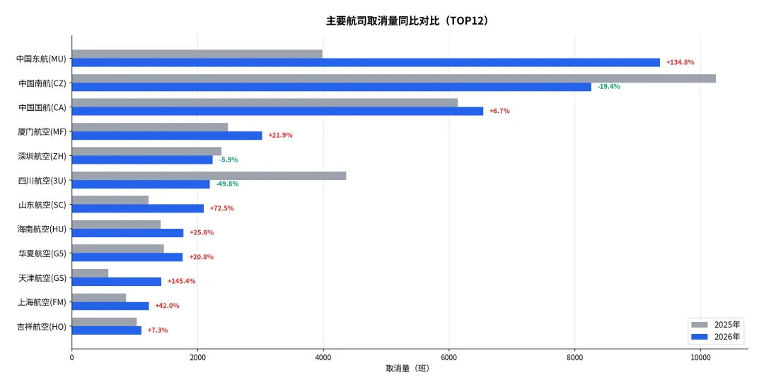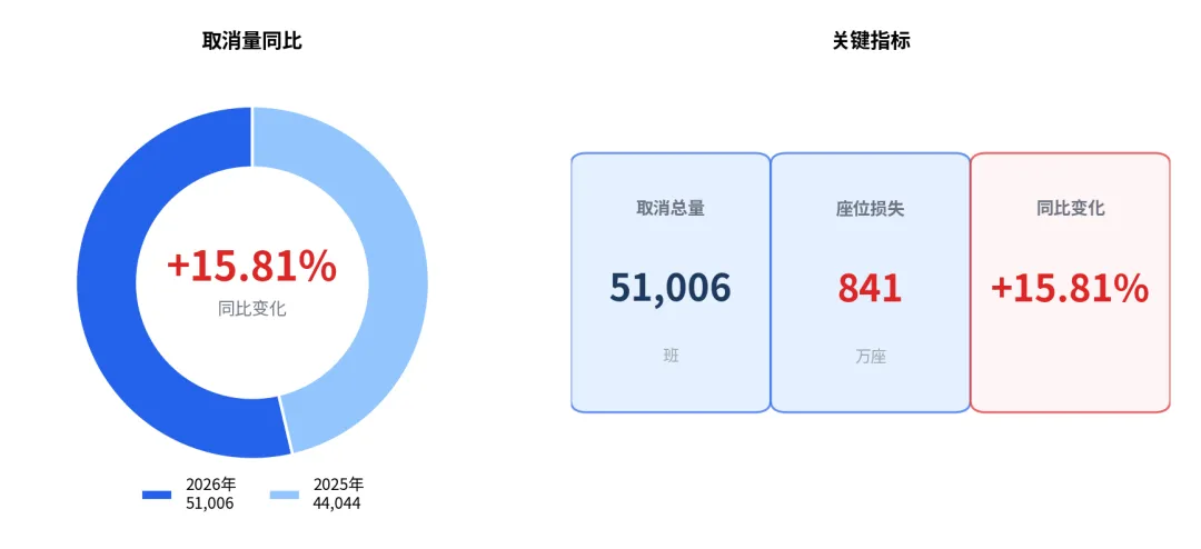 说明:已排除九元航空(AQ)和春秋航空(9C)数据。2026年周期内累计取消51,006班,2025年同期累计取消44,044班。