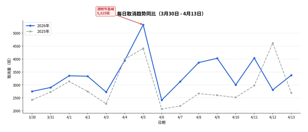 取消量最高日期为4月5日(清明节当天),单日取消量达5,325班。清明节假期三天(4月4日至6日)2026年取消量合计:4月4日3,943班 + 4月5日5,325班 + 4月6日2,415班 = 11,683班。假期首日和末日取消量显著低于正日子,呈现出典型的"假期中间高、两端低"特征。