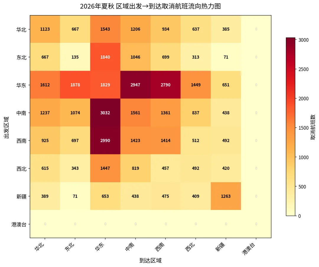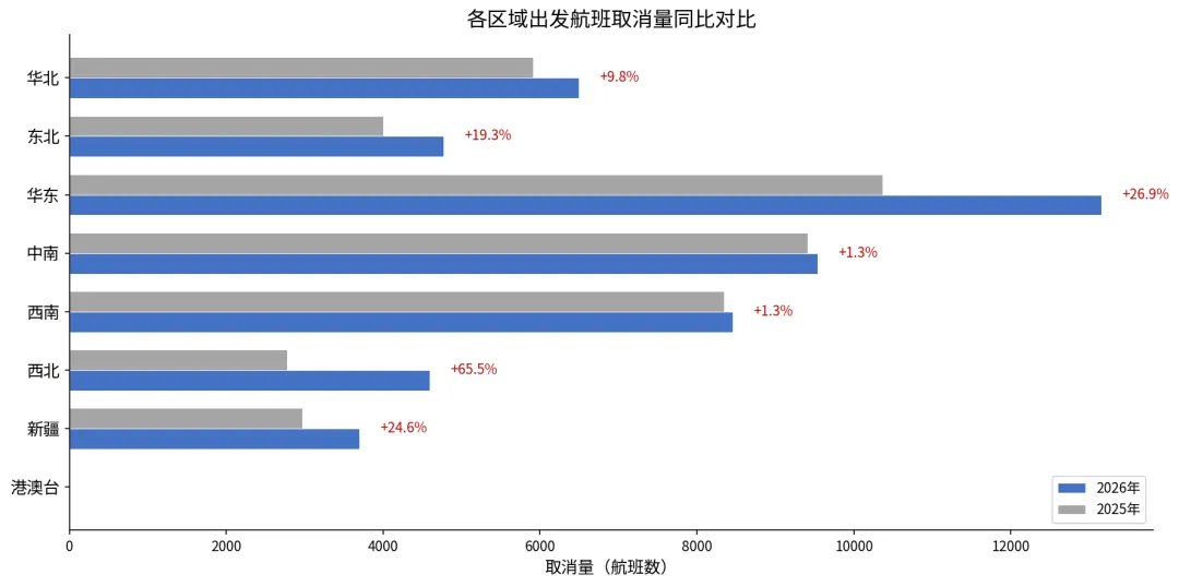 华东区域取消量最大(13,156班),同比增幅26.9%,是取消量的主要贡献区域。西北区域同比增幅最大(+65.5%),从2,776班增至4,593班。中南和西南区域取消量基本持平,同比增幅仅1.3%。