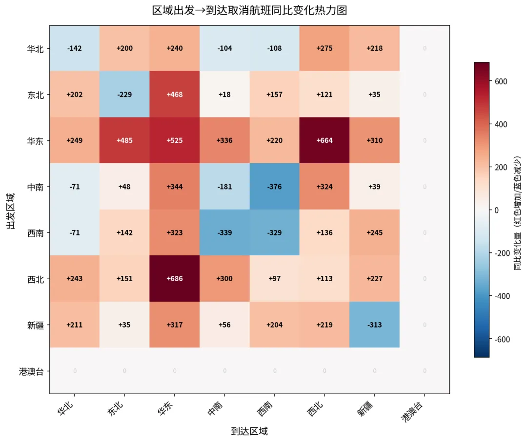 西北-华东双向流向是取消量增加最突出的航线走廊(西北→华东+686,华东→西北+664),反映西部方向航班调整幅度显著。中南-西南双向流向取消量明显减少,表明该走廊运力有所恢复。
