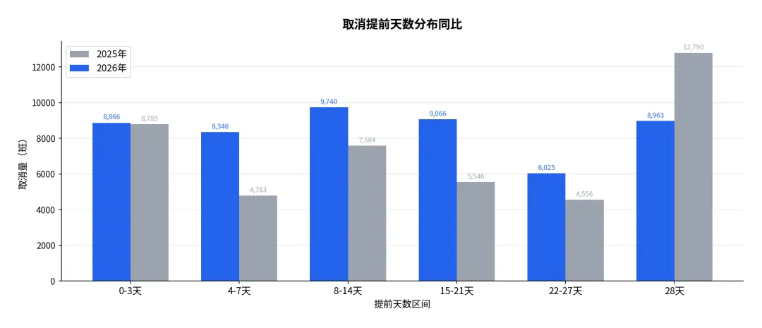 2026年取消提前天数分布呈现明显的"决策后移"特征:4-7天区间同比增加3,563班(+74.48%),15-21天区间同比增加3,520班(+63.50%),8-14天区间同比增加2,156班(+28.43%),22-27天区间同比增加1,469班(+32.24%)。