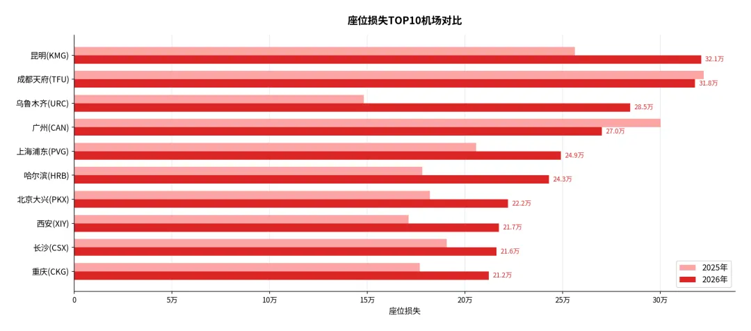 昆明(KMG)座位损失320,957个,同比增加64,689个,位居首位; 乌鲁木齐(URC)座位损失284,554个,同比增加136,434个,增幅最大; 天府(TFU)座位损失317,787个,同比减少4,498个,是TOP10中唯一下降的机场; 广州(CAN)座位损失270,123个,同比减少30,111个,降幅显著。