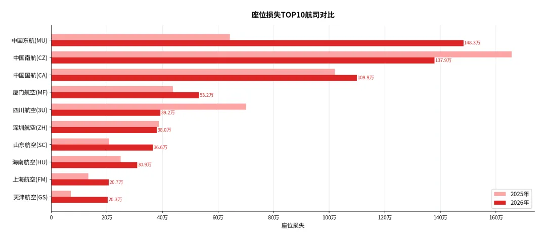 中国东航(MU)座位损失1,483,016个,同比增加840,409个,远超其他航司; 中国南航(CZ)座位损失1,379,002个,同比减少277,091个,是减少量最大的航司; 四川航空(3U)座位损失392,255个,同比减少308,292个,降幅达43.99%。