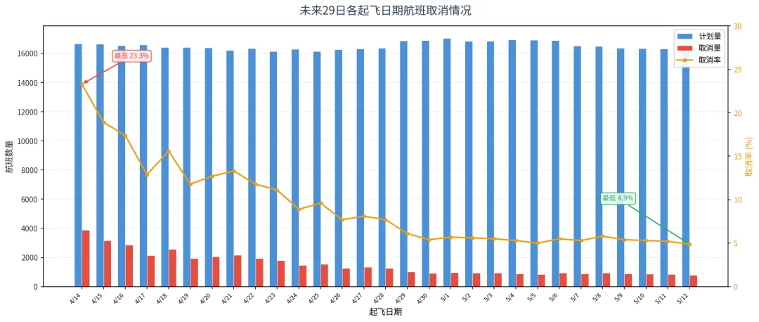 未来29日(4月14日至5月12日)全国机场计划航班495,680班,已取消44,057班,剩余执行451,623班,整体取消率8.89%。各起飞日期取消情况详见上表。