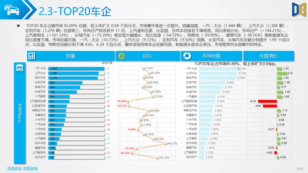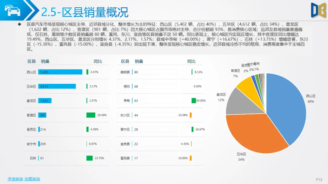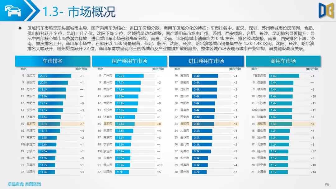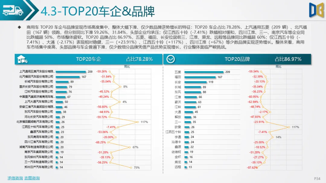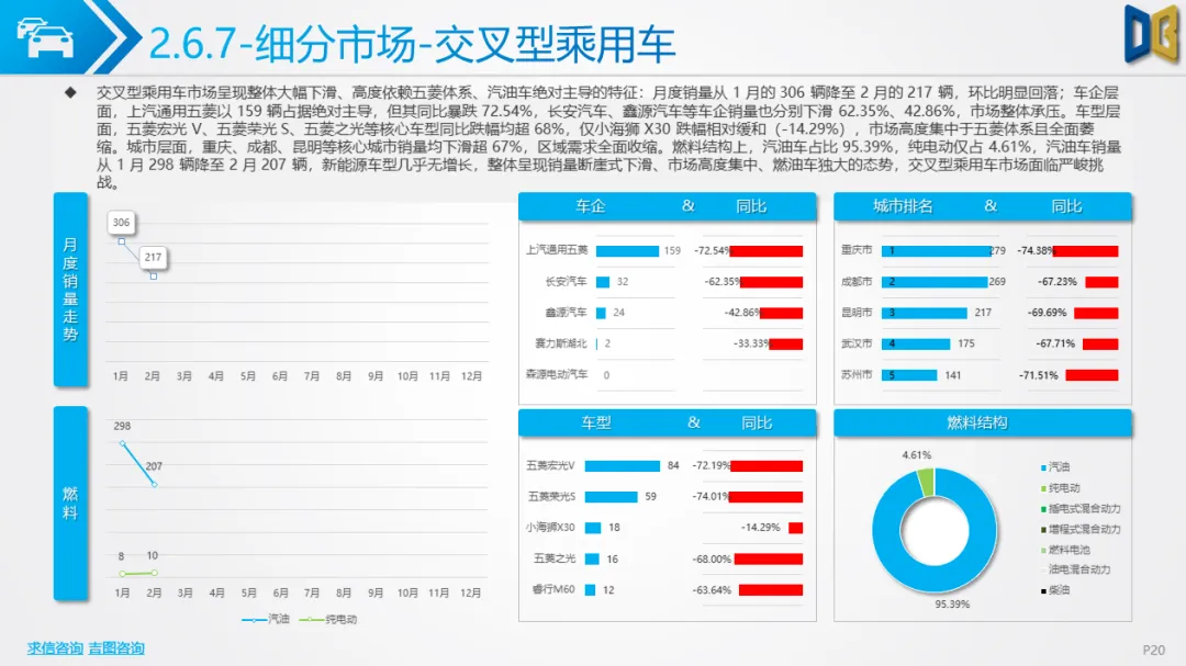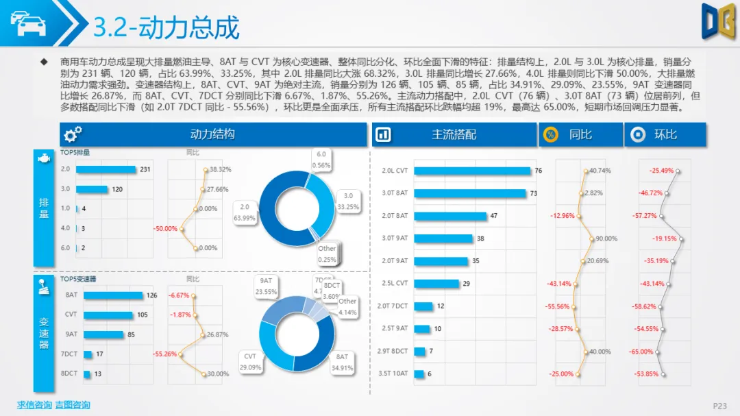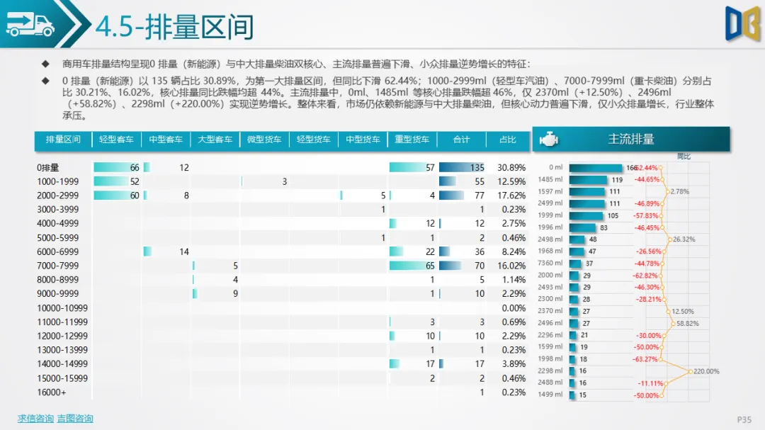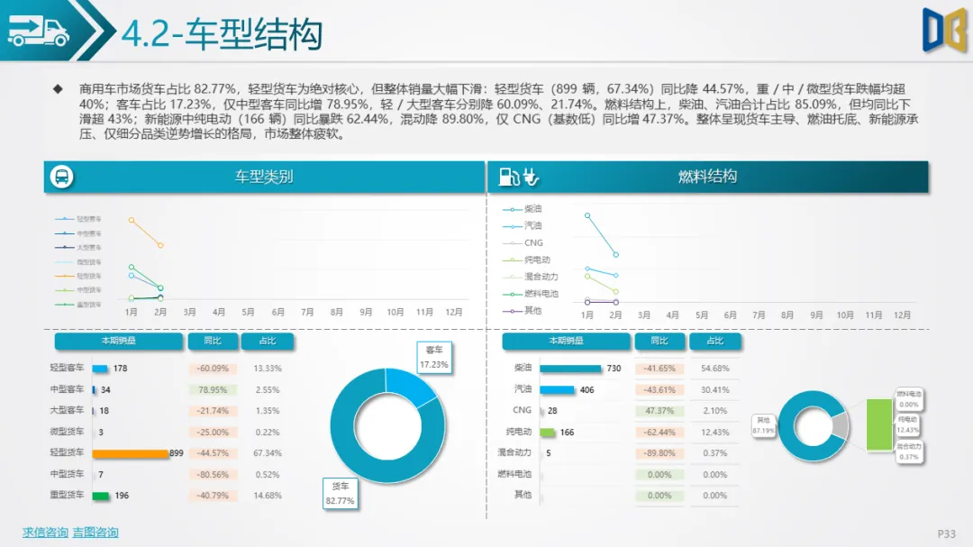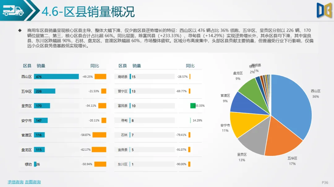 商用车方面表现更弱,累计同比由正转负,环比跌幅超40%,下游基建、物流需求疲软导致复苏乏力。车型结构上,货车占比超82%,轻型货车为绝对核心但同比跌幅超44%,客车仅中型客车逆势增长;燃料以柴油、汽油为主(合计占比85%),新能源车型(纯电动、混动)跌幅超60%,仅CNG 小幅增长。品牌与区域高度集中,TOP20车企 / 品牌占比超78%,头部企业(五菱、福田)普遍下滑,仅三一、江西五十铃等少数品牌逆势增长;核心区县贡献超66% 销量但普遍下滑,仅富民县、寻甸县等小众区县因基数低实现正增长。排量结构上,0 排量(新能源)与7000-7999ml(重卡柴油)为双核心,主流排量普遍下滑,仅小众排量实现逆势增长。