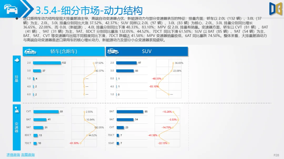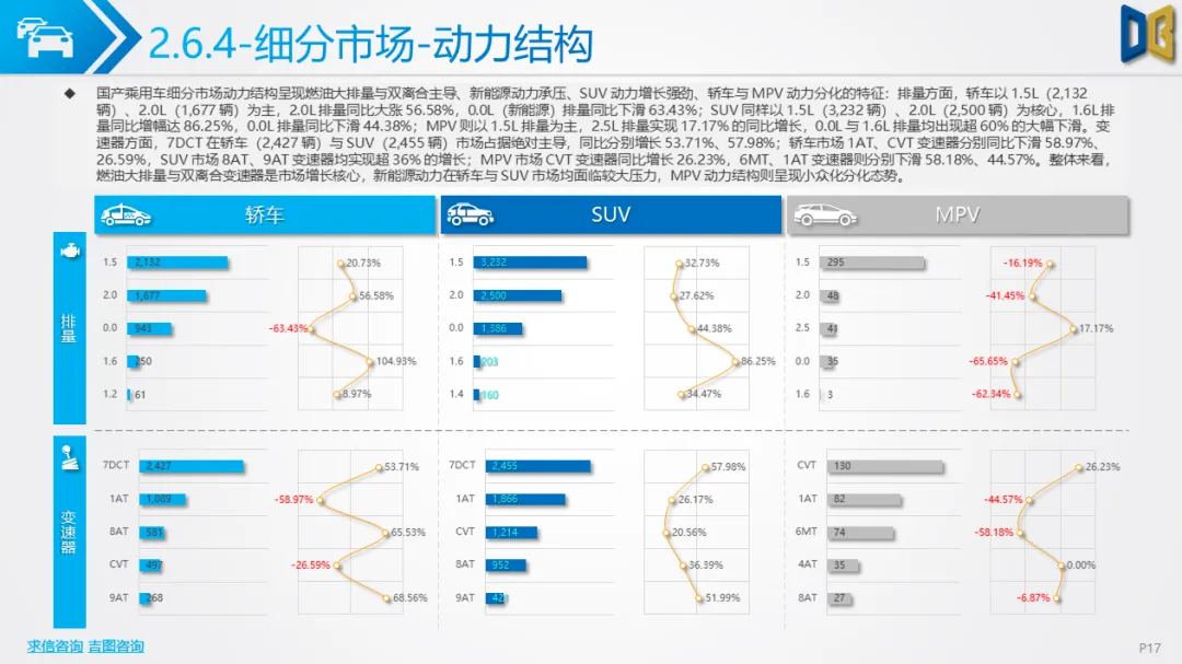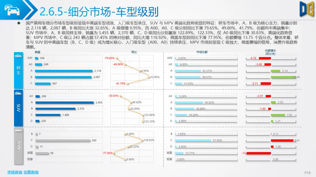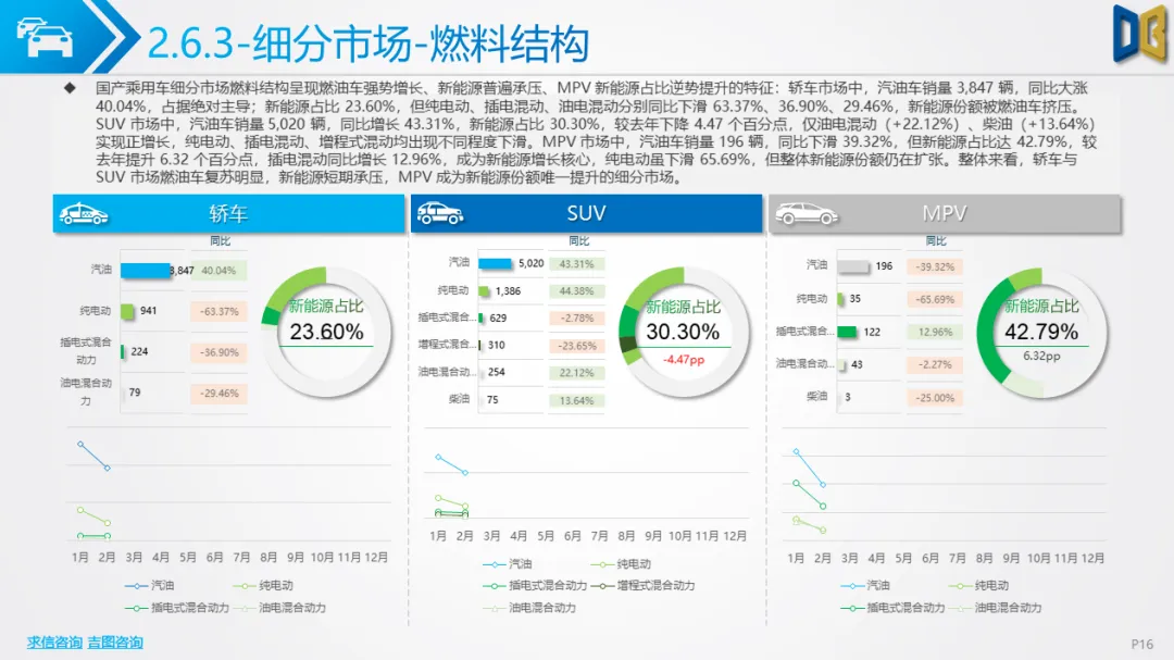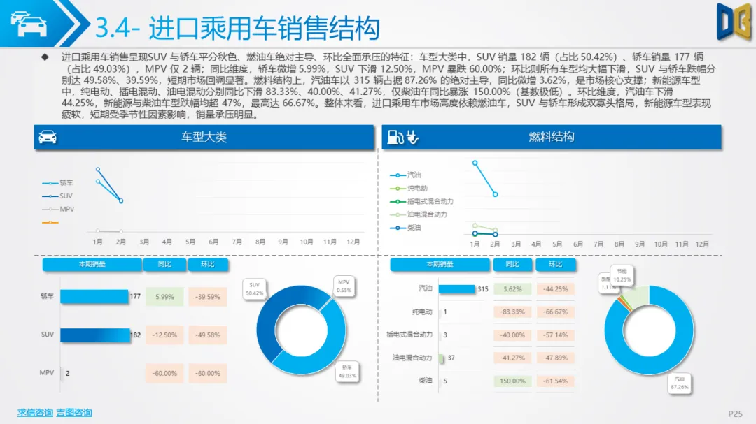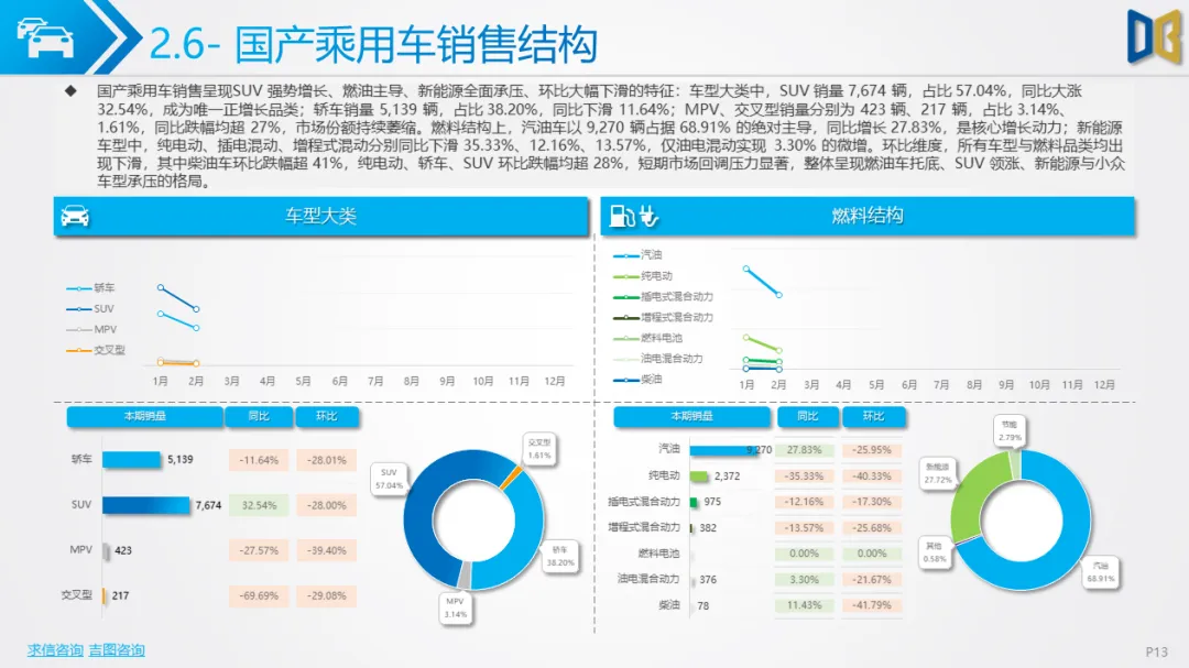 乘用车方面,累计同比小幅下滑,环比跌幅明显,消费升级趋势凸显:中高端B/C/D 级车型领涨,入门级A00/A0 车型持续萎缩。动力结构上,燃油大排量(2.0L/3.0L)与双离合变速器(7DCT)为核心增长动力,新能源车型在轿车、SUV市场普遍承压,份额持续萎缩;进口乘用车高度依赖汽油车,新能源占比不足 2%。品牌与车型层面,自主与合资品牌分化明显,SUV、MPV市场新势力及高端车型(如赛那、梦想家)表现亮眼,传统燃油车型与入门级交叉型乘用车销量断崖式下滑;进口乘用车消费向高端化、个性化集中,MPV市场高度萎缩。