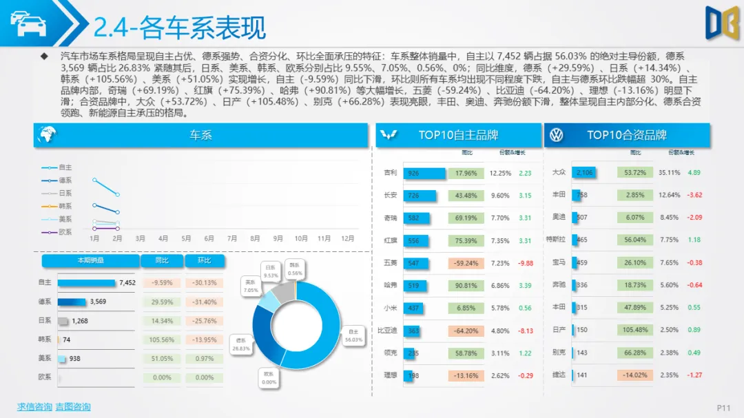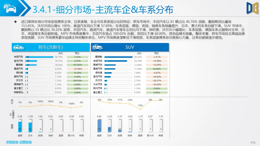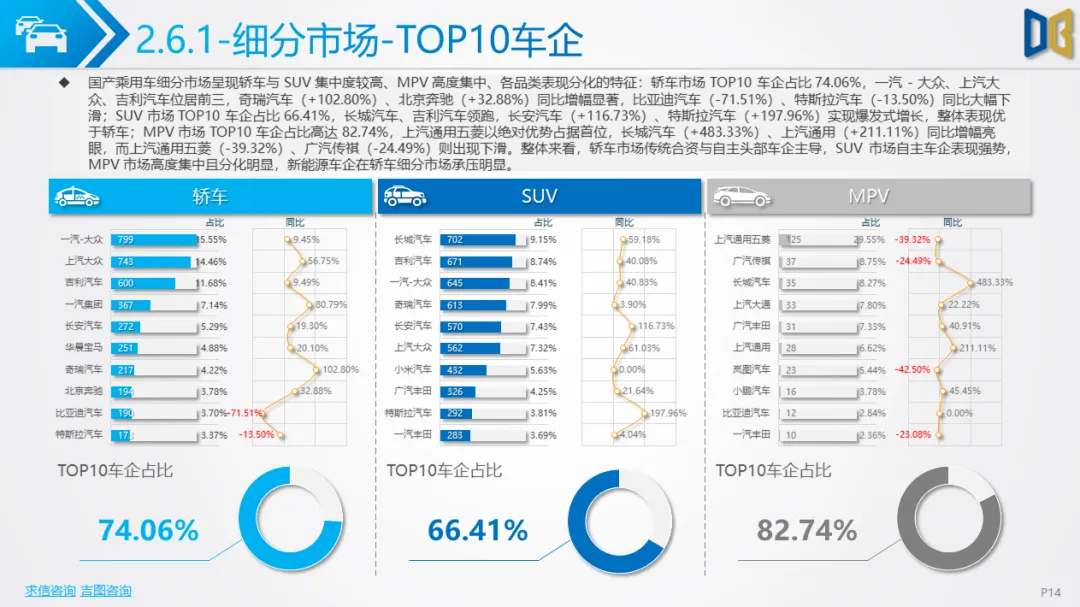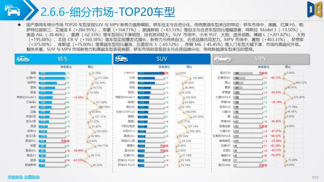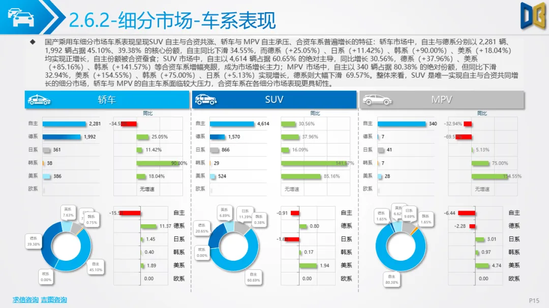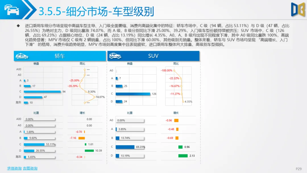 乘用车方面,累计同比小幅下滑,环比跌幅明显,消费升级趋势凸显:中高端B/C/D 级车型领涨,入门级A00/A0 车型持续萎缩。动力结构上,燃油大排量(2.0L/3.0L)与双离合变速器(7DCT)为核心增长动力,新能源车型在轿车、SUV市场普遍承压,份额持续萎缩;进口乘用车高度依赖汽油车,新能源占比不足 2%。品牌与车型层面,自主与合资品牌分化明显,SUV、MPV市场新势力及高端车型(如赛那、梦想家)表现亮眼,传统燃油车型与入门级交叉型乘用车销量断崖式下滑;进口乘用车消费向高端化、个性化集中,MPV市场高度萎缩。