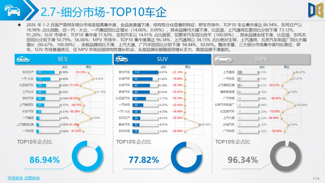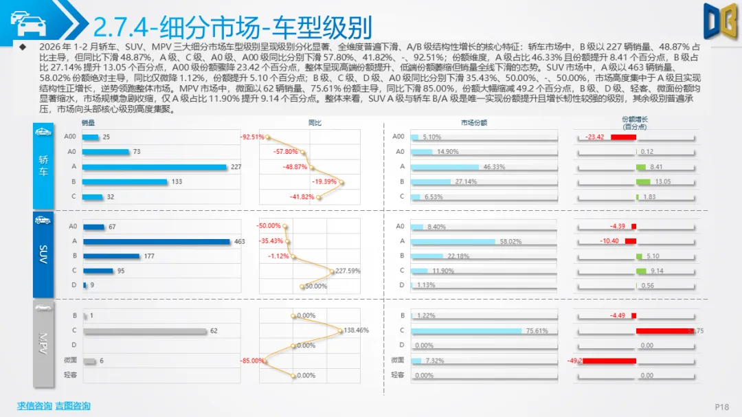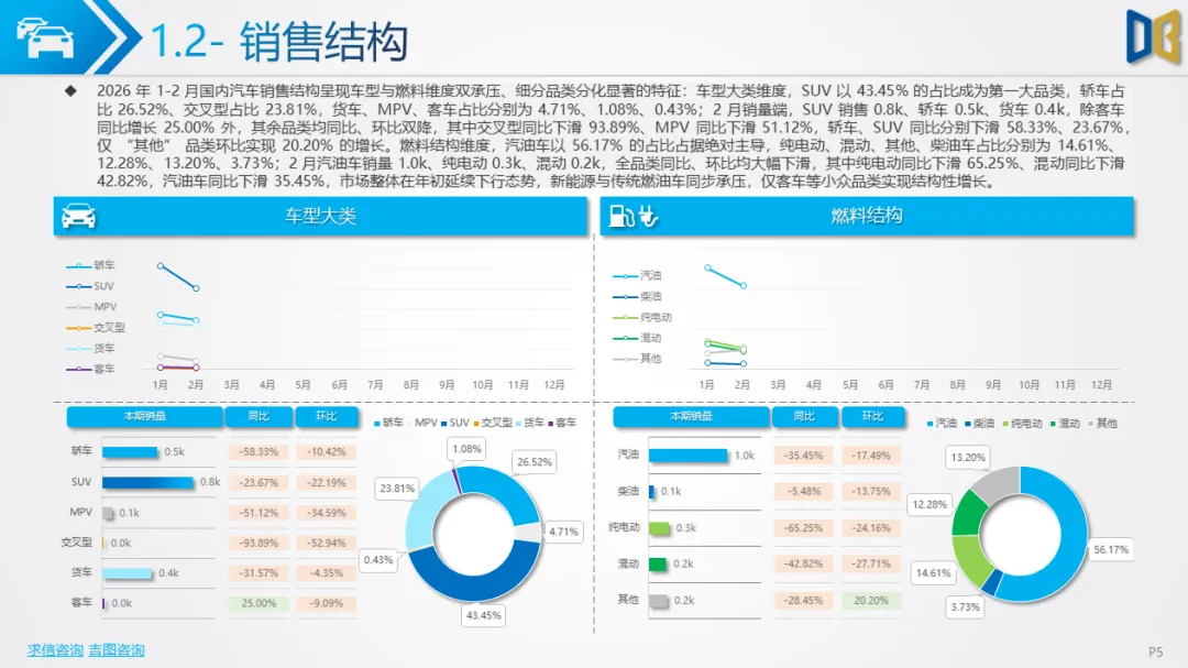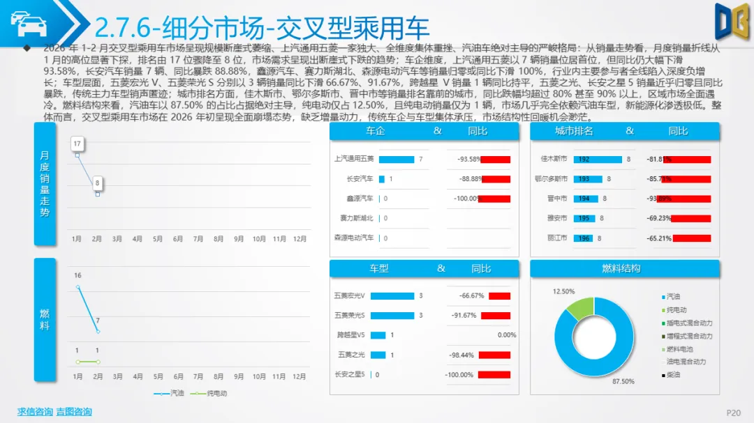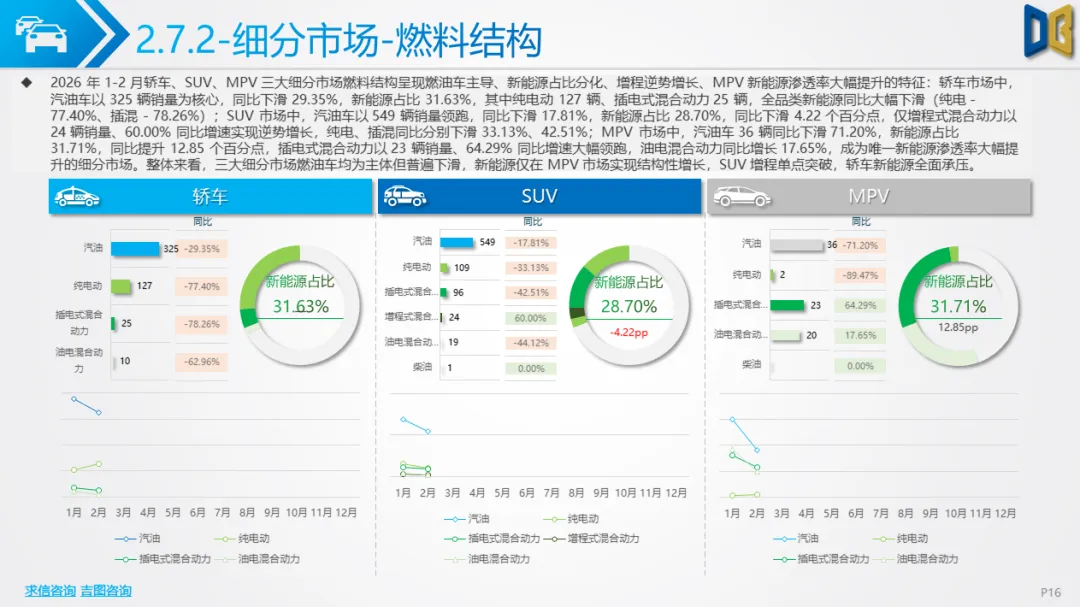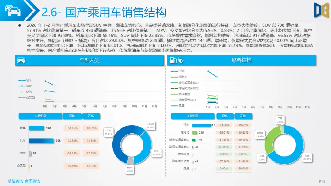 一、乘用车市场:规模腰斩,结构向头部集中1-2月乘用车累计销量同比大幅下滑超60%,月度销量持续低于去年同期,市场需求极度疲软。结构上,SUV与轿车为核心品类,MPV规模极小;燃料端,新能源占比约30%,但纯电、插混同比大幅下滑,仅增程式在SUV、MPV市场单点突破;动力端,1.5L小排量与7DCT/CVT变速器主导市场,全品类普遍承压;车型级别上,SUV A 级、轿车B/A级份额逆势提升,低端车型全面萎缩;交叉型乘用车市场近乎崩塌,五菱系车型同比暴跌超90%,区域市场全面遇冷。