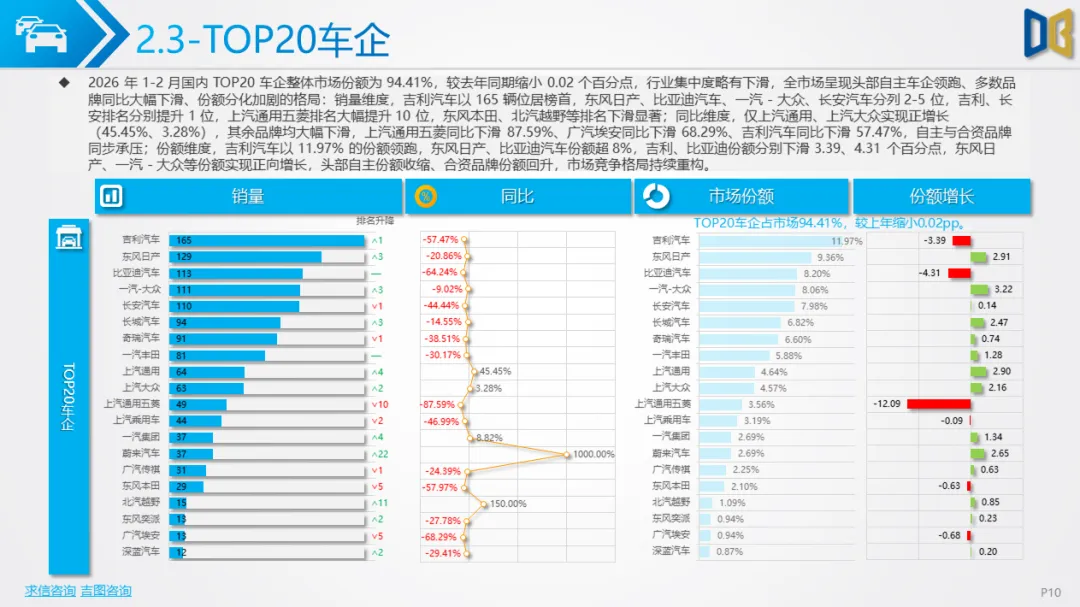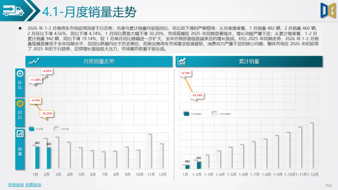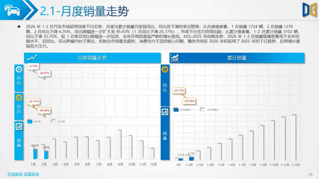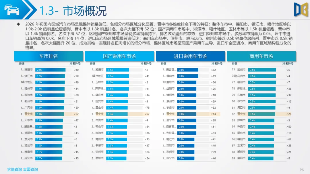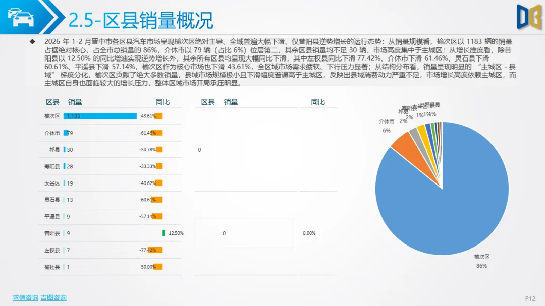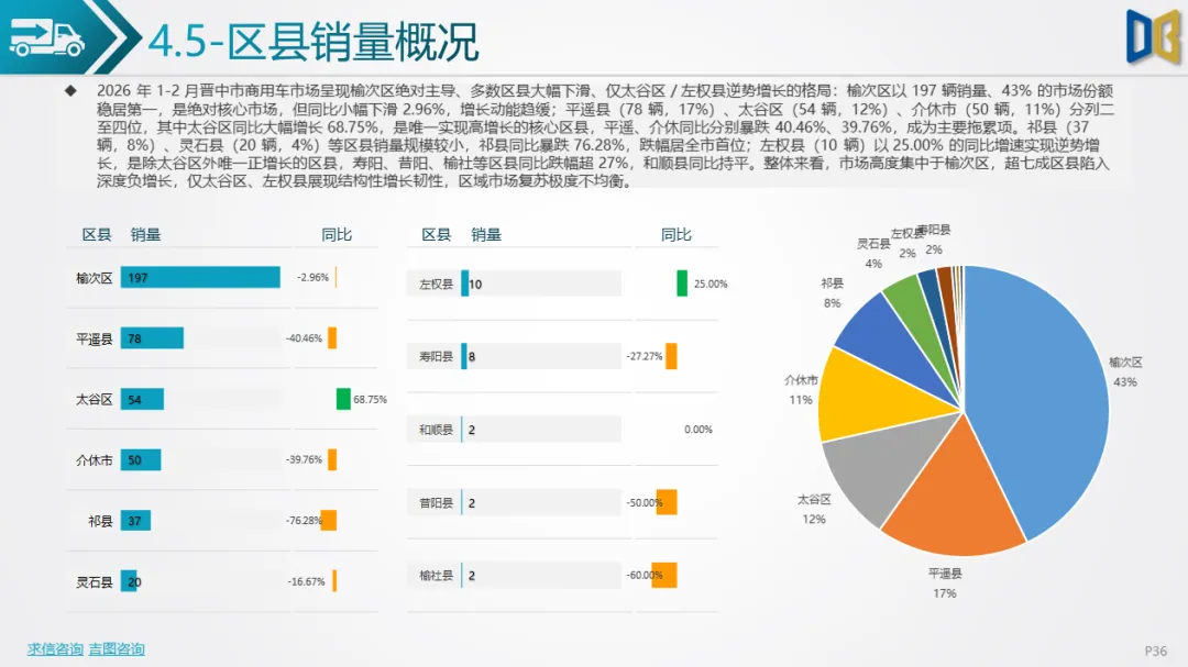 四、核心结论与趋势展望整体市场持续承压:三大板块均陷入深度负增长,消费动力严重不足,全年开局面临极端压力。结构分化加剧:市场向头部品牌、核心车型、大排量重卡高度集中,低端车型、非核心品类全面萎缩。新能源渗透缓慢:乘用车新能源占比停滞,进口车新能源缺位,仅商用车纯电实现小幅增长,新能源化进程滞后。区域复苏不均衡:商用车市场高度依赖榆次区,多数区县大幅下滑,仅少数区县展现增长韧性。