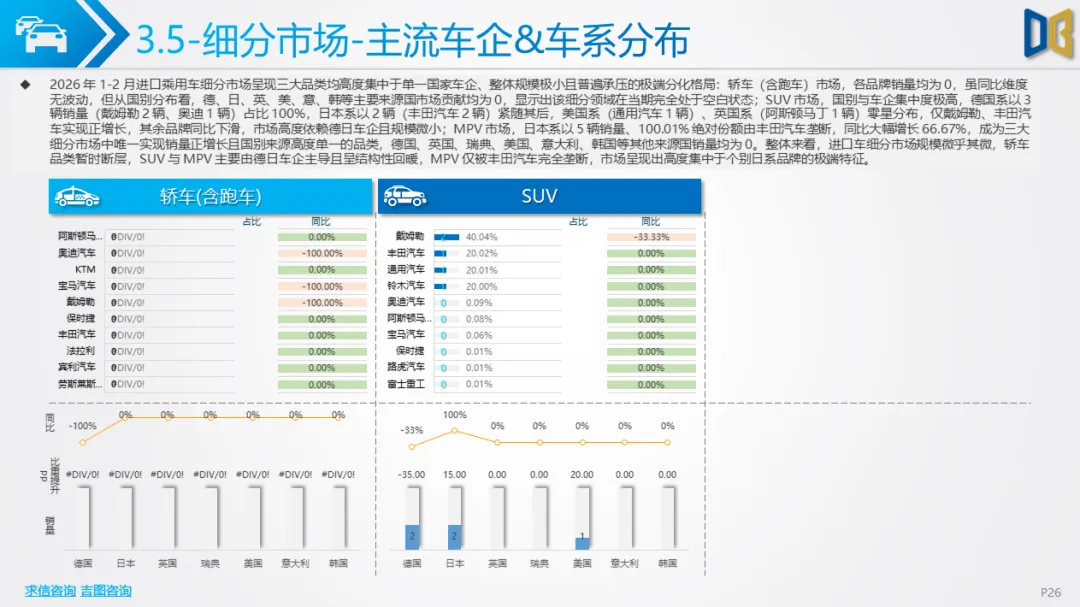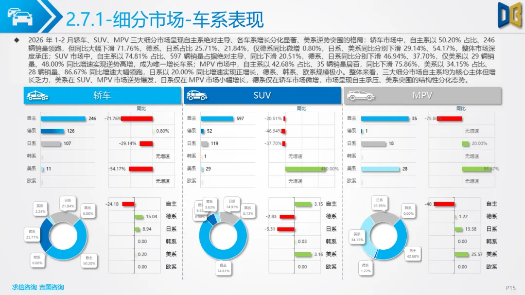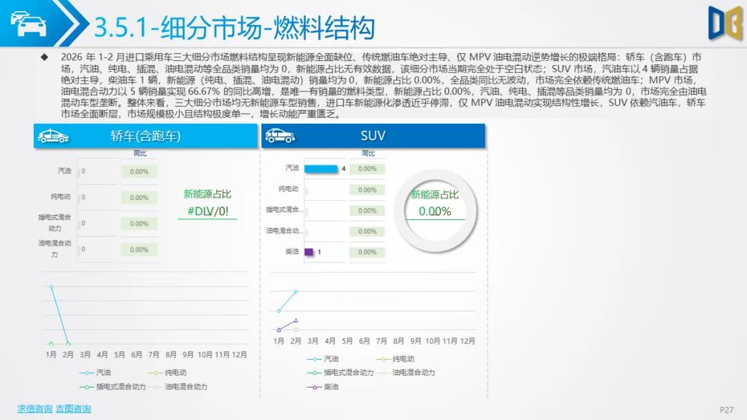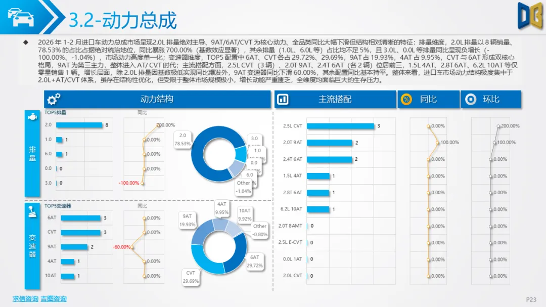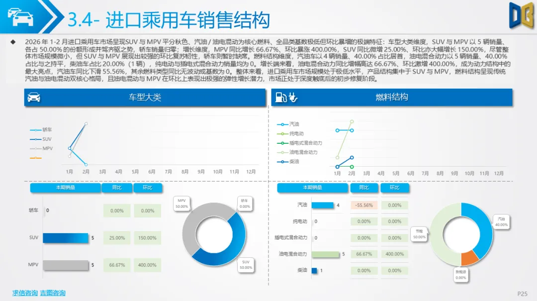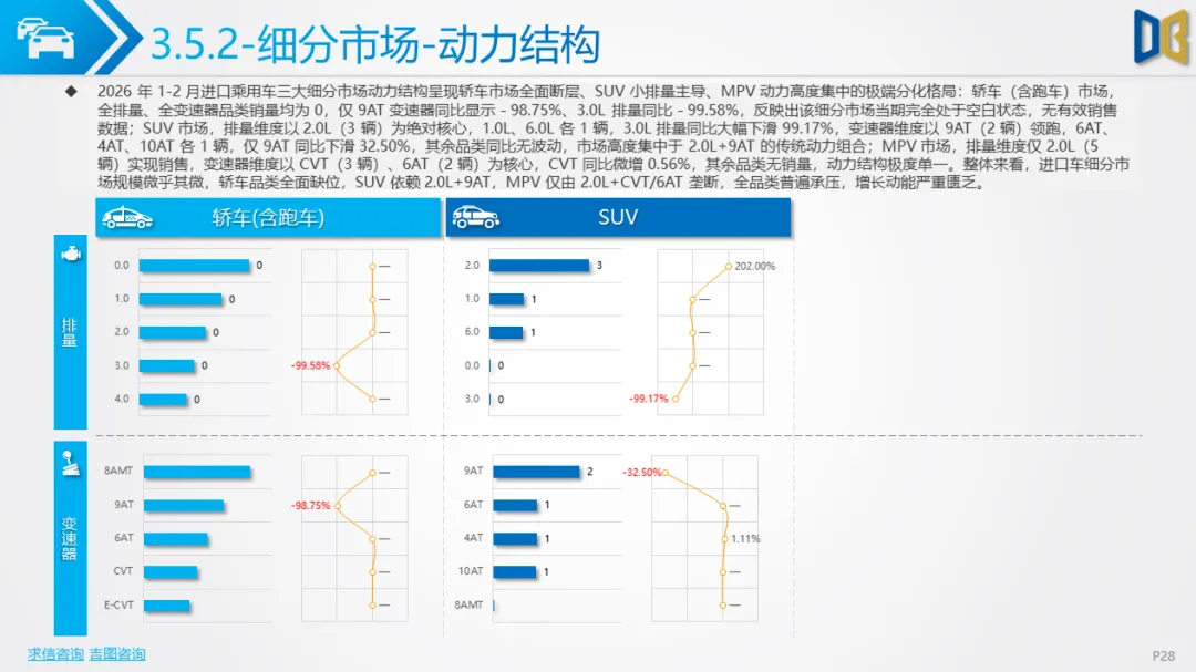 二、进口车市场:规模极度萎缩,日系一家独大1-2月进口车累计销量仅15辆,同比下滑超60%,市场规模微乎其微。结构上,日系品牌(丰田)以70%份额绝对垄断,德系品牌全面溃败,美系仅在SUV、MPV市场零星增长;车型端,SUV与MPV各占50%,轿车市场全面归零;燃料端,油电混动在MPV市场同比暴涨66.67%,新能源渗透率为0,完全依赖传统燃油车;动力端,2.0L+AT/CVT体系高度集中,仅少数配置实现基数性增长。