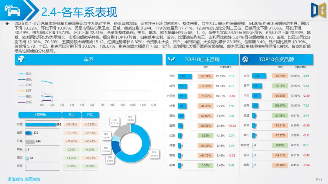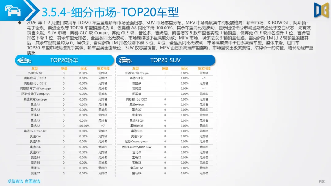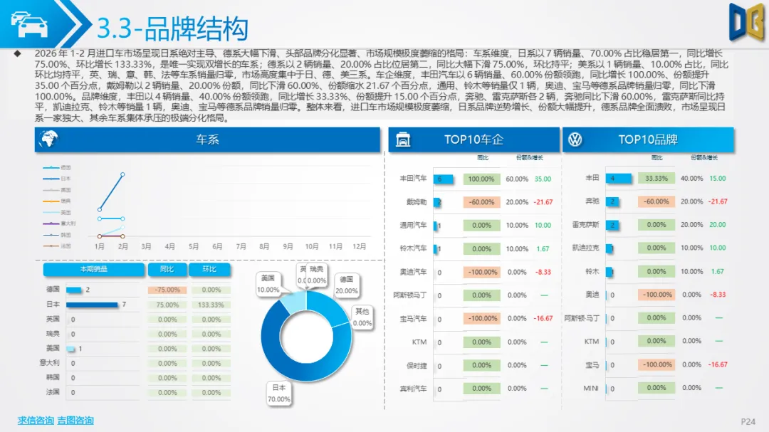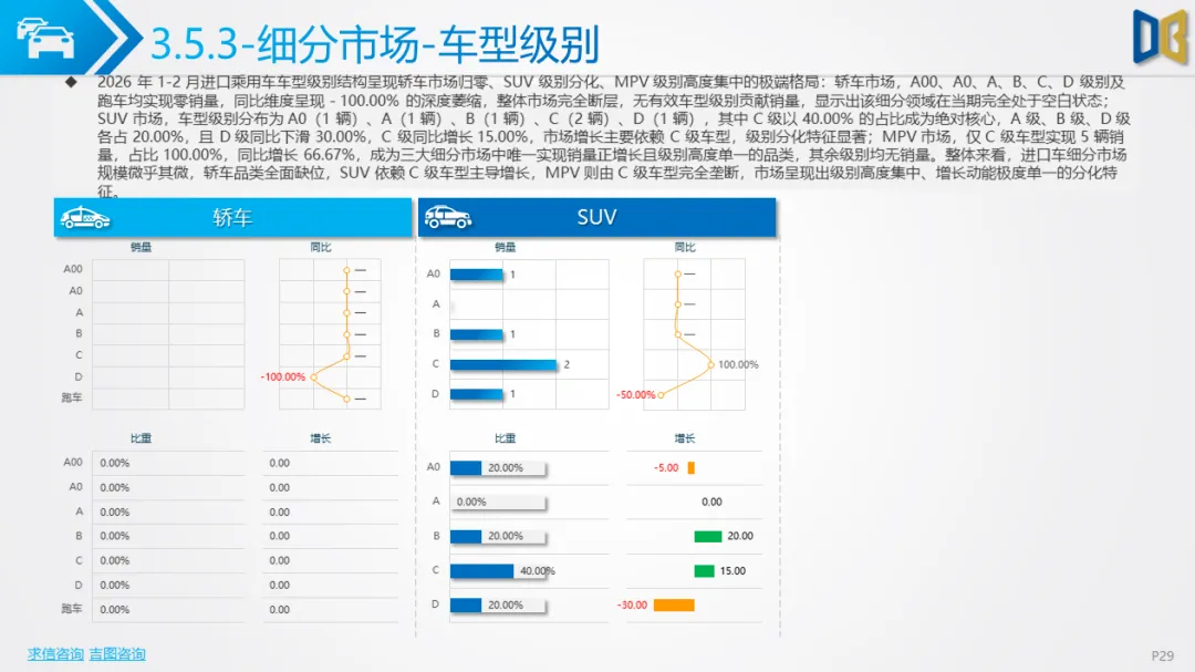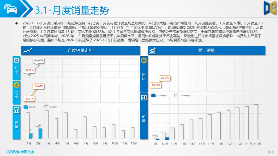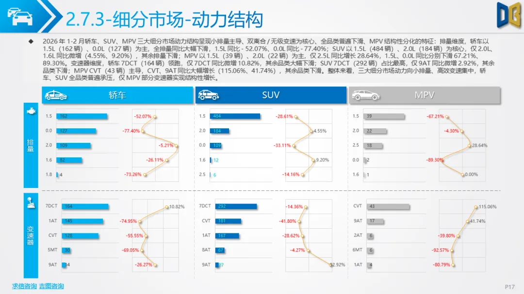 二、进口车市场:规模极度萎缩,日系一家独大1-2月进口车累计销量仅15辆,同比下滑超60%,市场规模微乎其微。结构上,日系品牌(丰田)以70%份额绝对垄断,德系品牌全面溃败,美系仅在SUV、MPV市场零星增长;车型端,SUV与MPV各占50%,轿车市场全面归零;燃料端,油电混动在MPV市场同比暴涨66.67%,新能源渗透率为0,完全依赖传统燃油车;动力端,2.0L+AT/CVT体系高度集中,仅少数配置实现基数性增长。