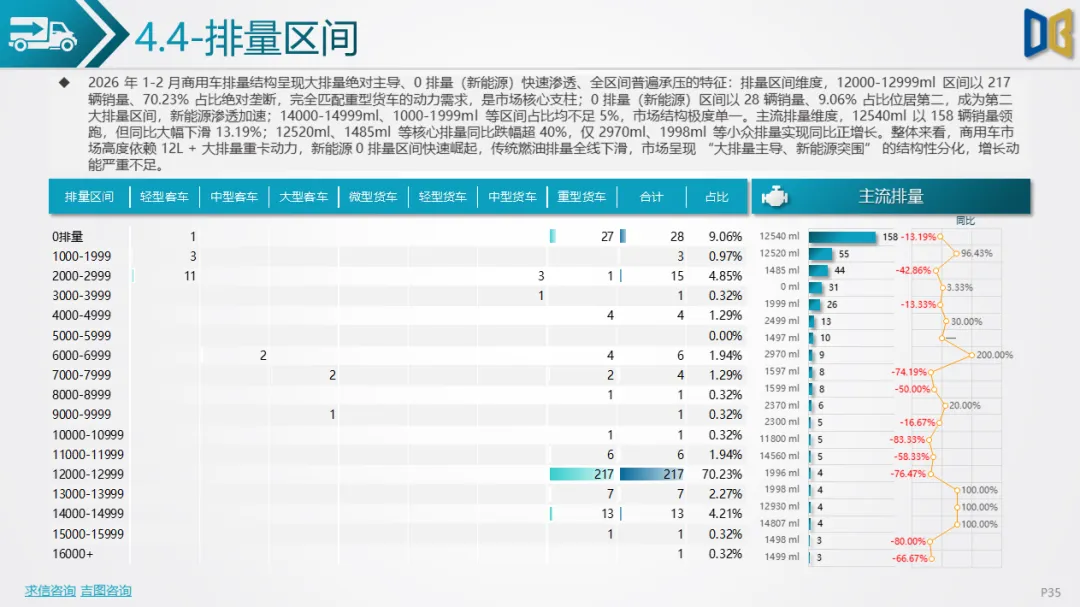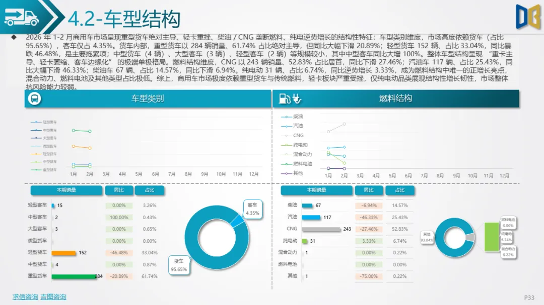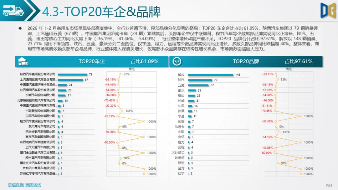 三、商用车市场:重卡主导,全行业普遍下滑1-2月商用车累计销量同比下滑19.14%,月度销量持续下行。结构上,重型货车以61.74%份额绝对主导,轻型货车同比暴跌46.48%,成为主要拖累;燃料端,CNG以52.83%份额居首,纯电动以6.74%占比逆势增长3.33%,是唯一正增长品类;品牌端,TOP20品牌占比97.61%,解放、陕汽、五菱头部品牌同比跌幅超20%,仅尾部小众品牌实现正增长;排量端,12000-12999ml大排量区间以70.23%份额垄断市场,0 排量(新能源)以9.06%占比快速渗透;区域端,榆次区以43%份额绝对主导,超七成区县同比下滑,仅太谷区(+68.75%)、左权县(+25.00%)实现逆势增长。